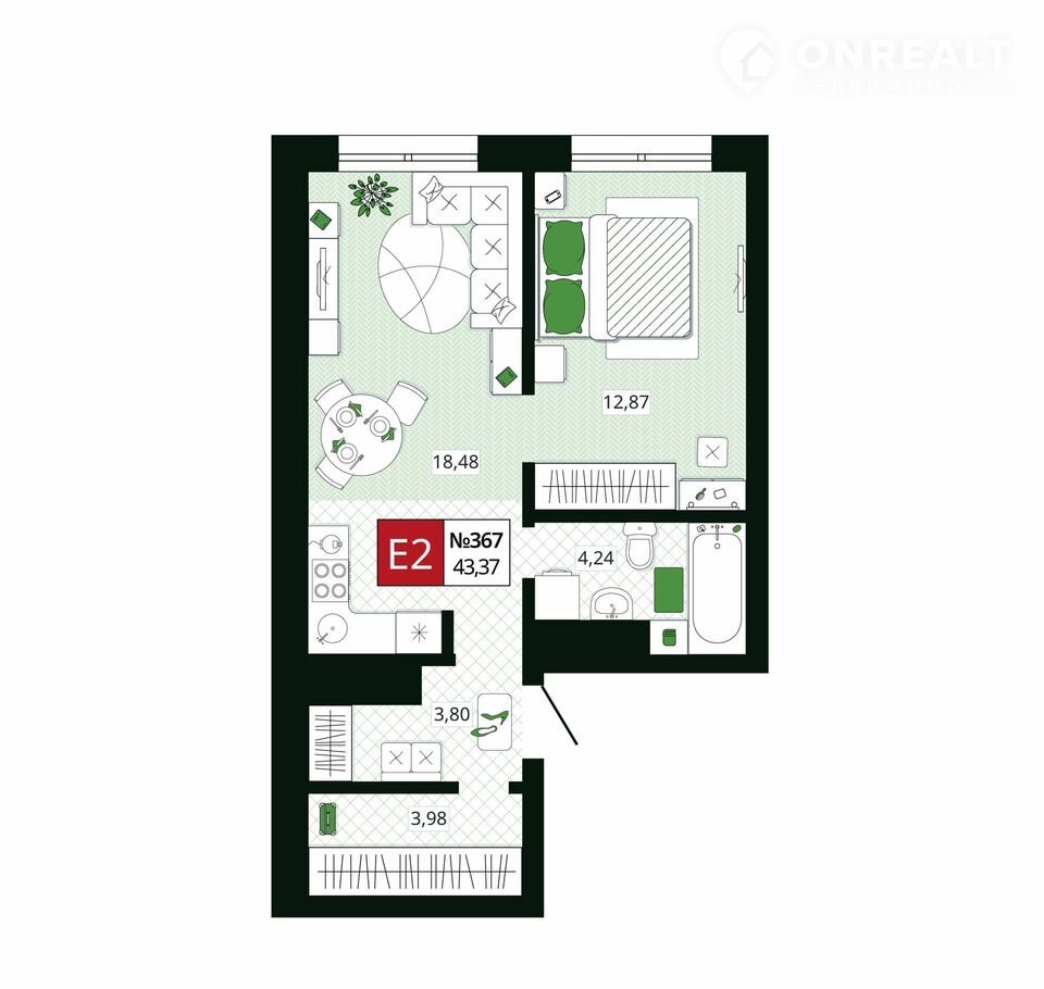 Общая площадь 43.4 м2
