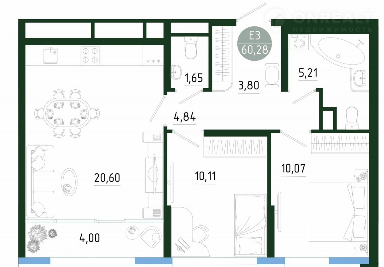 Общая площадь 60.3 м2