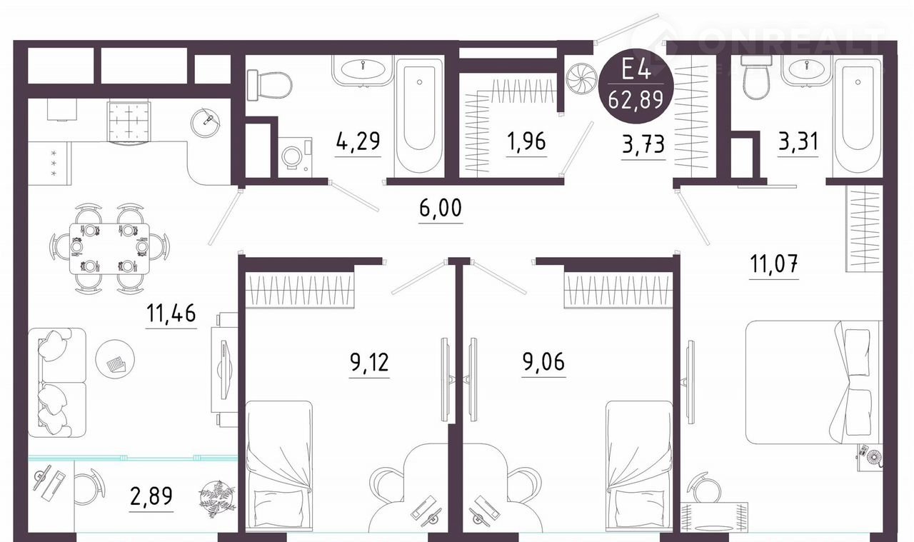 Общая площадь 62.9 м2