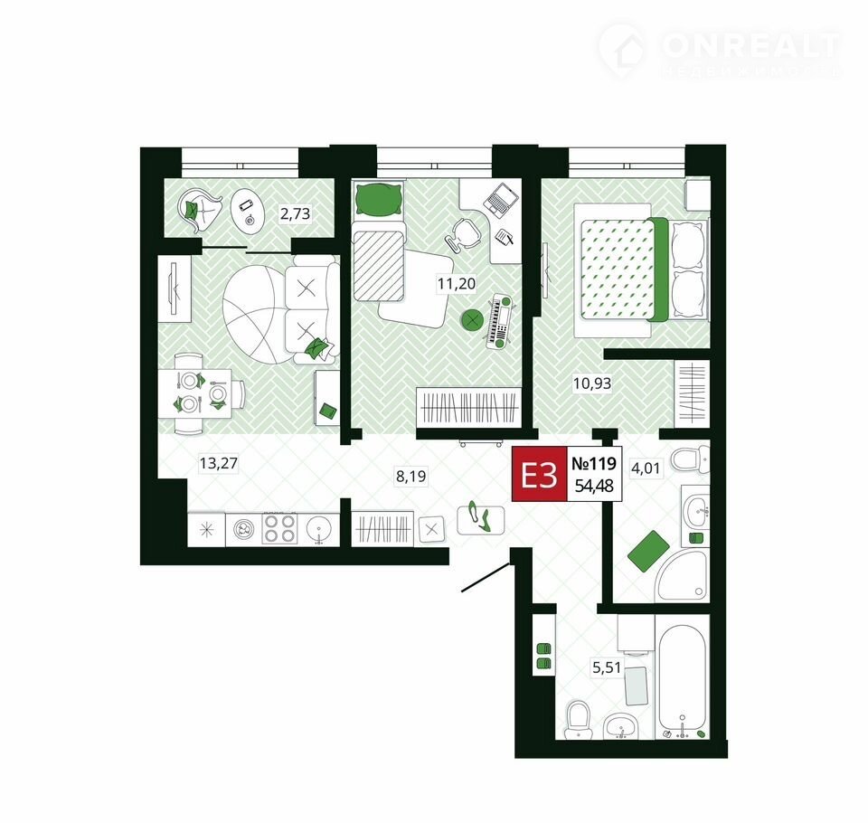 Общая площадь 54.5 м2