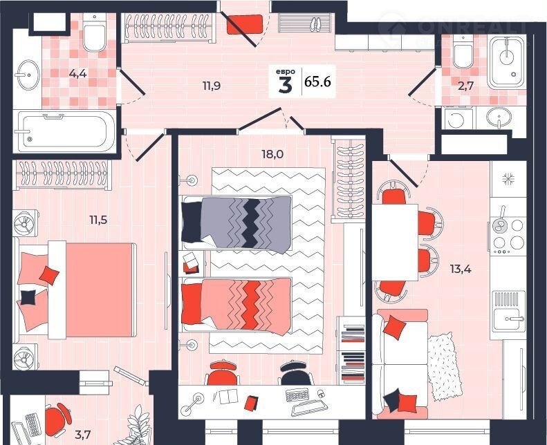 Общая площадь 65.6 м2