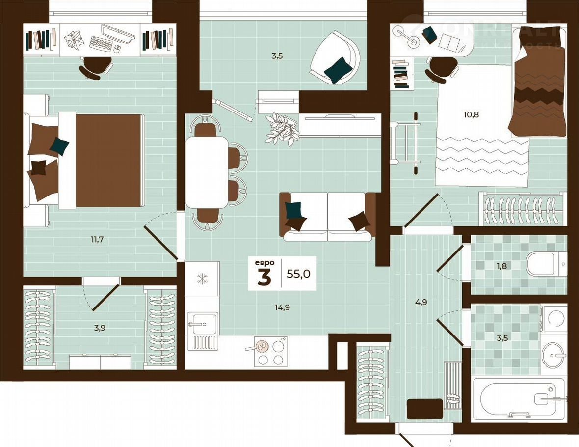 Общая площадь 55 м2