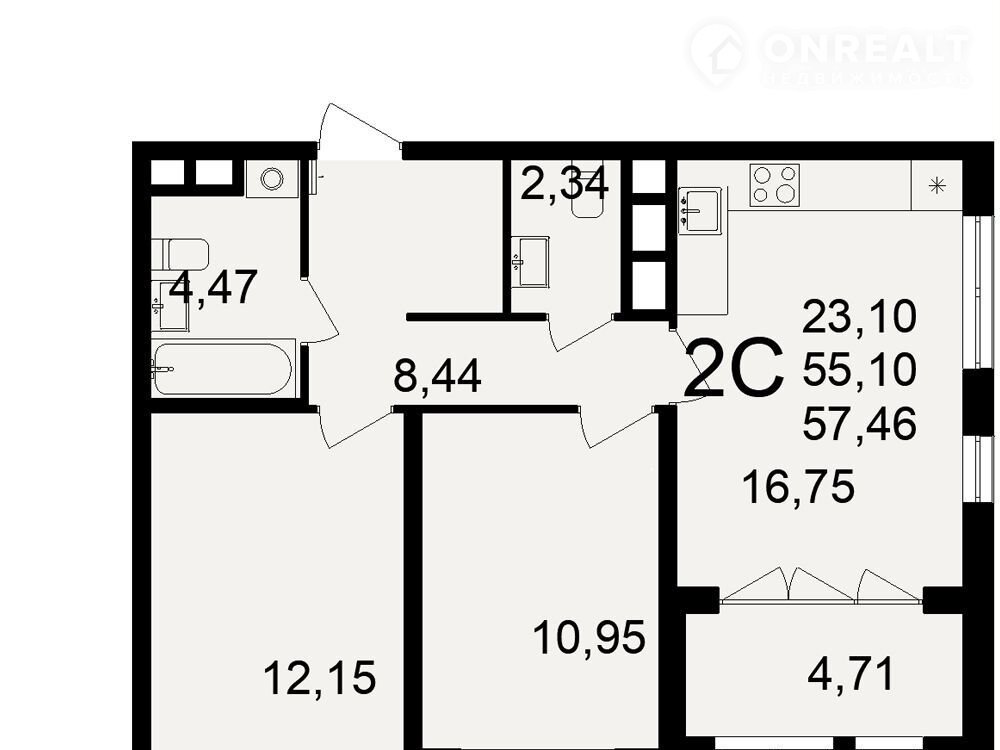 Общая площадь 57.5 м2