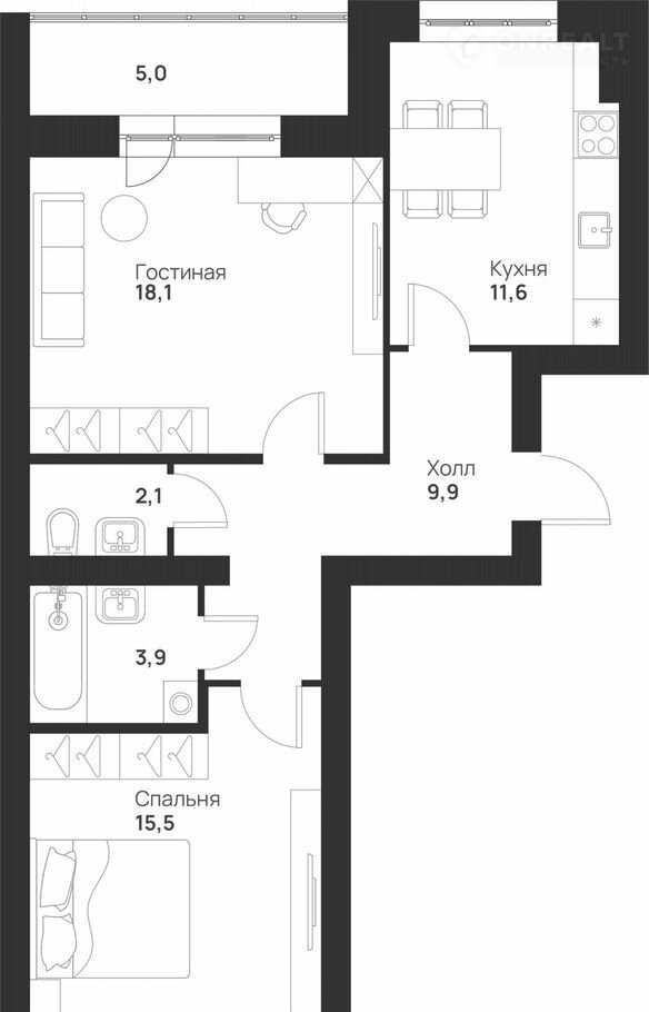 Жилая площадь 54.5 м2