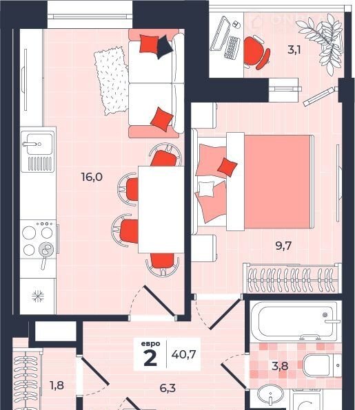 Общая площадь 40.7 м2