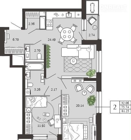 2-комнатная квартира, 81.3 м2, этаж 17 / 20, на продажу в Туле