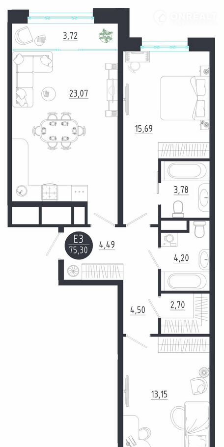 Общая площадь 75.3 м2