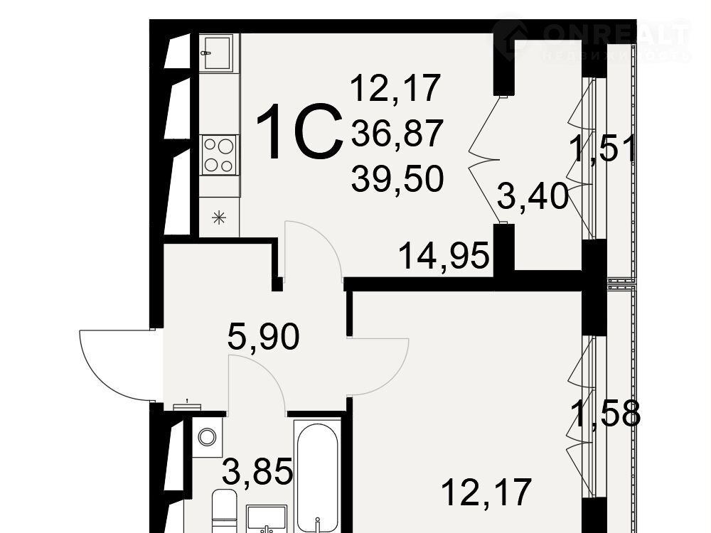 Общая площадь 39.5 м2