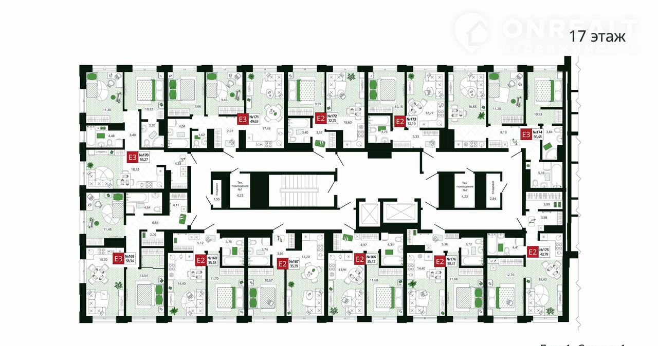 2-комнатная квартира, 58.1 м2, этаж 17 / 19, на продажу в Туле