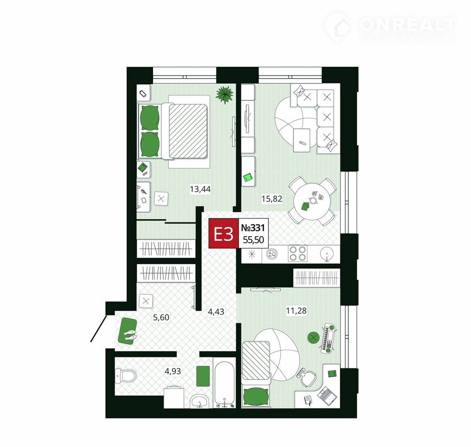 Общая площадь 55.5 м2