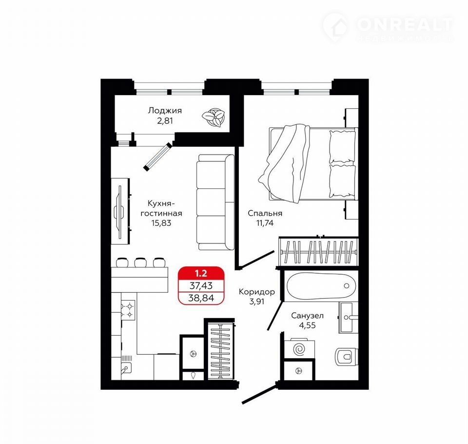 Общая площадь 37.7 м2