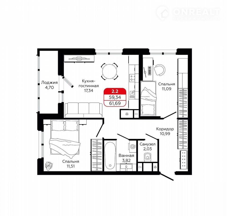 Общая площадь 59.6 м2
