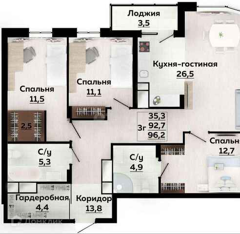 Общая площадь 92.6 м2