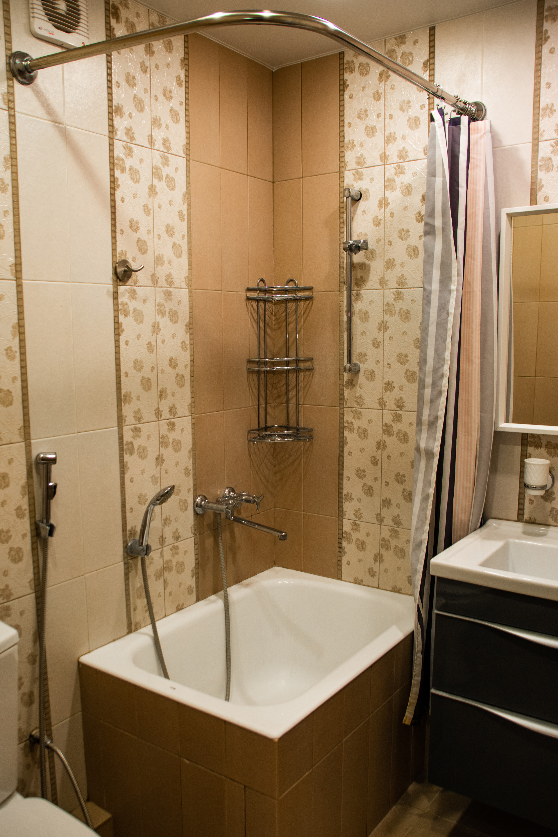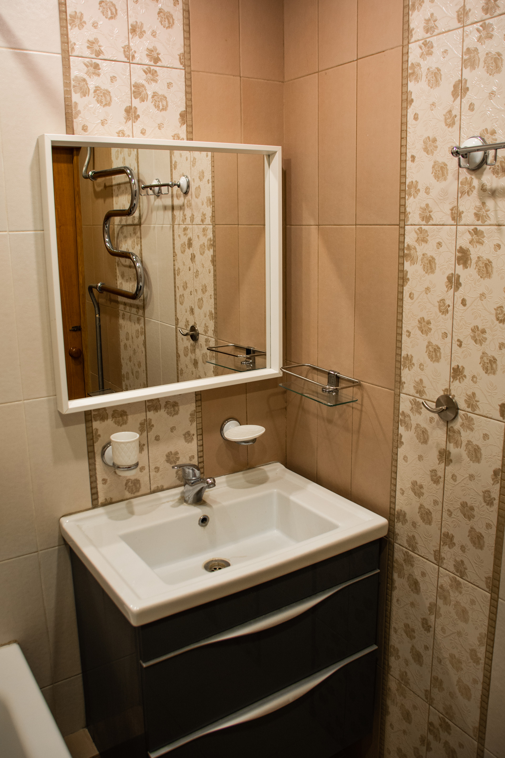 Теплый пол в санузле, кондиционер в комнате.