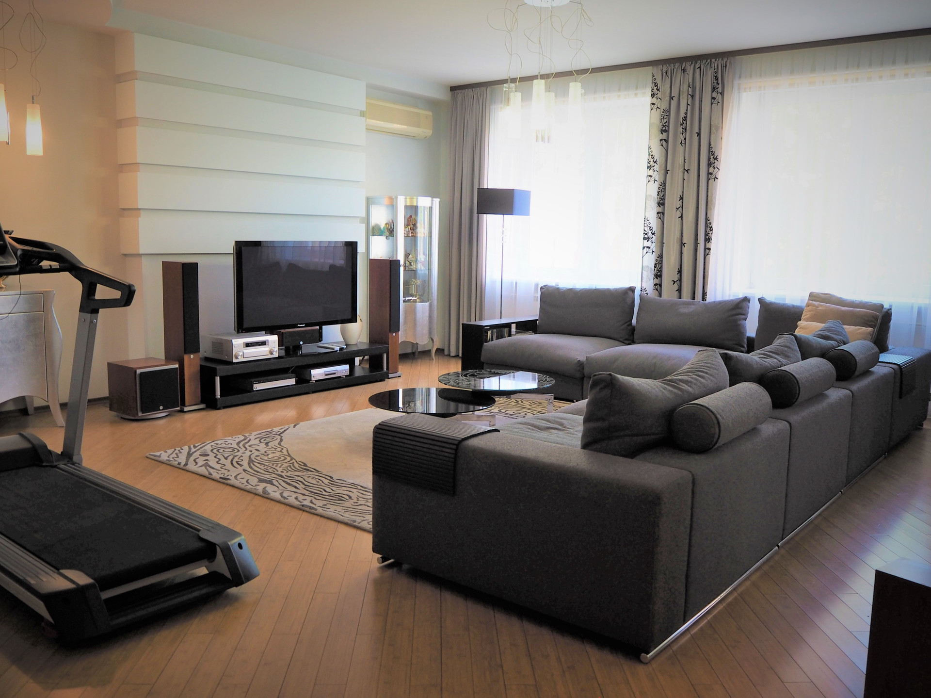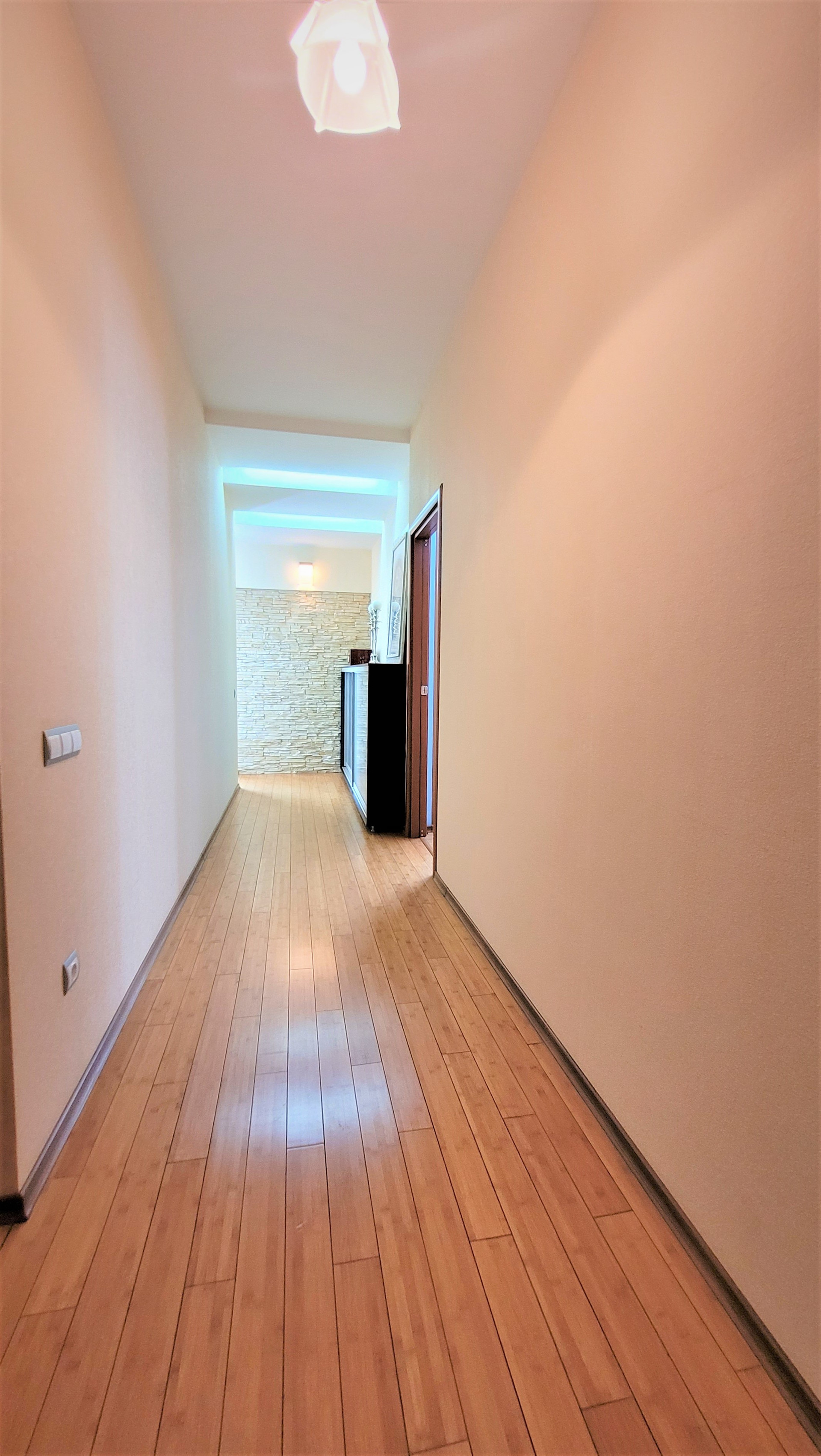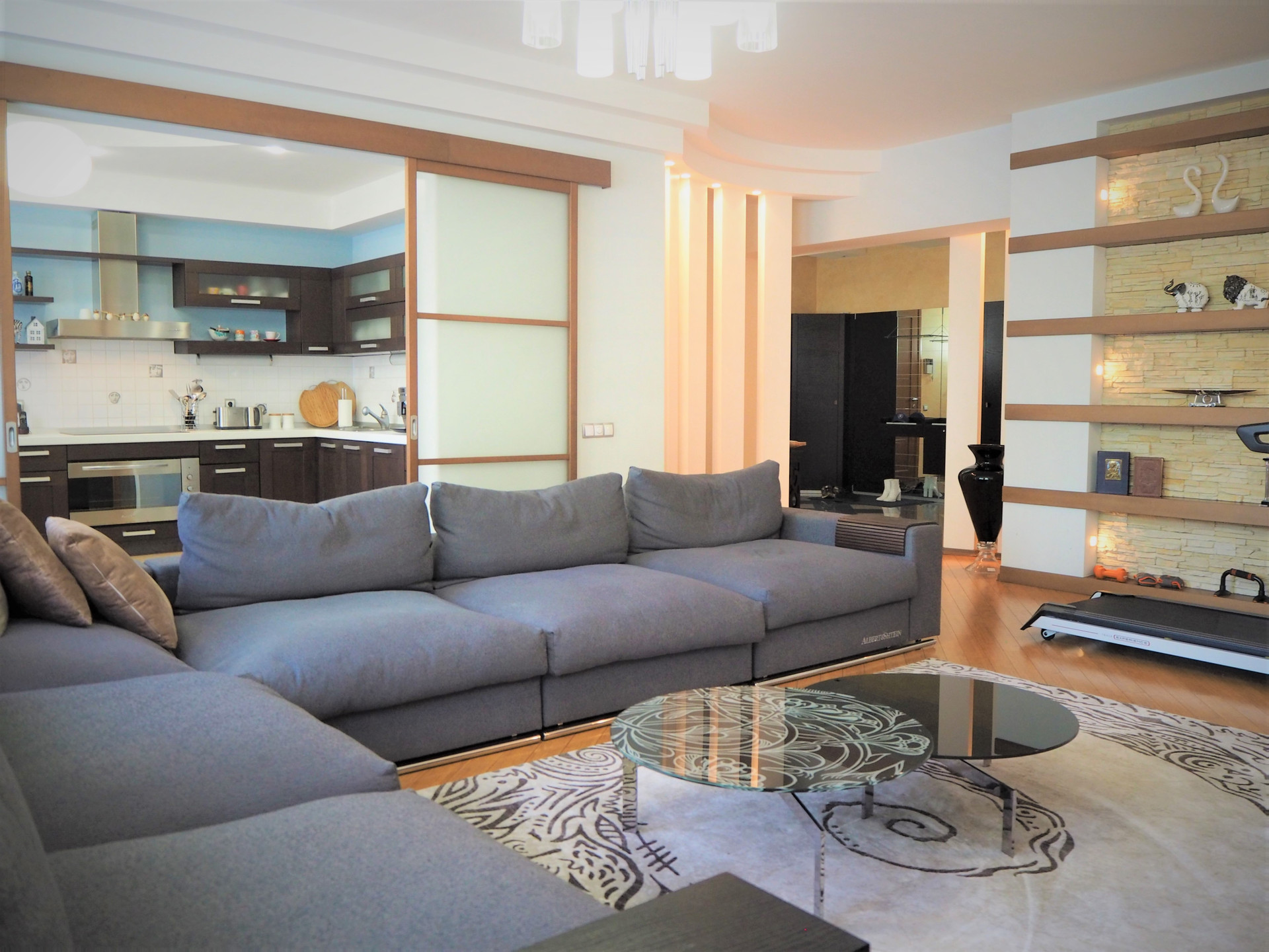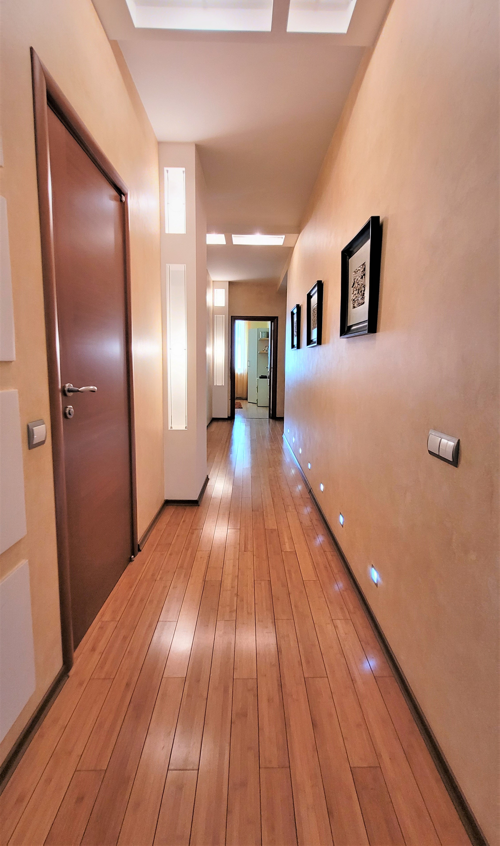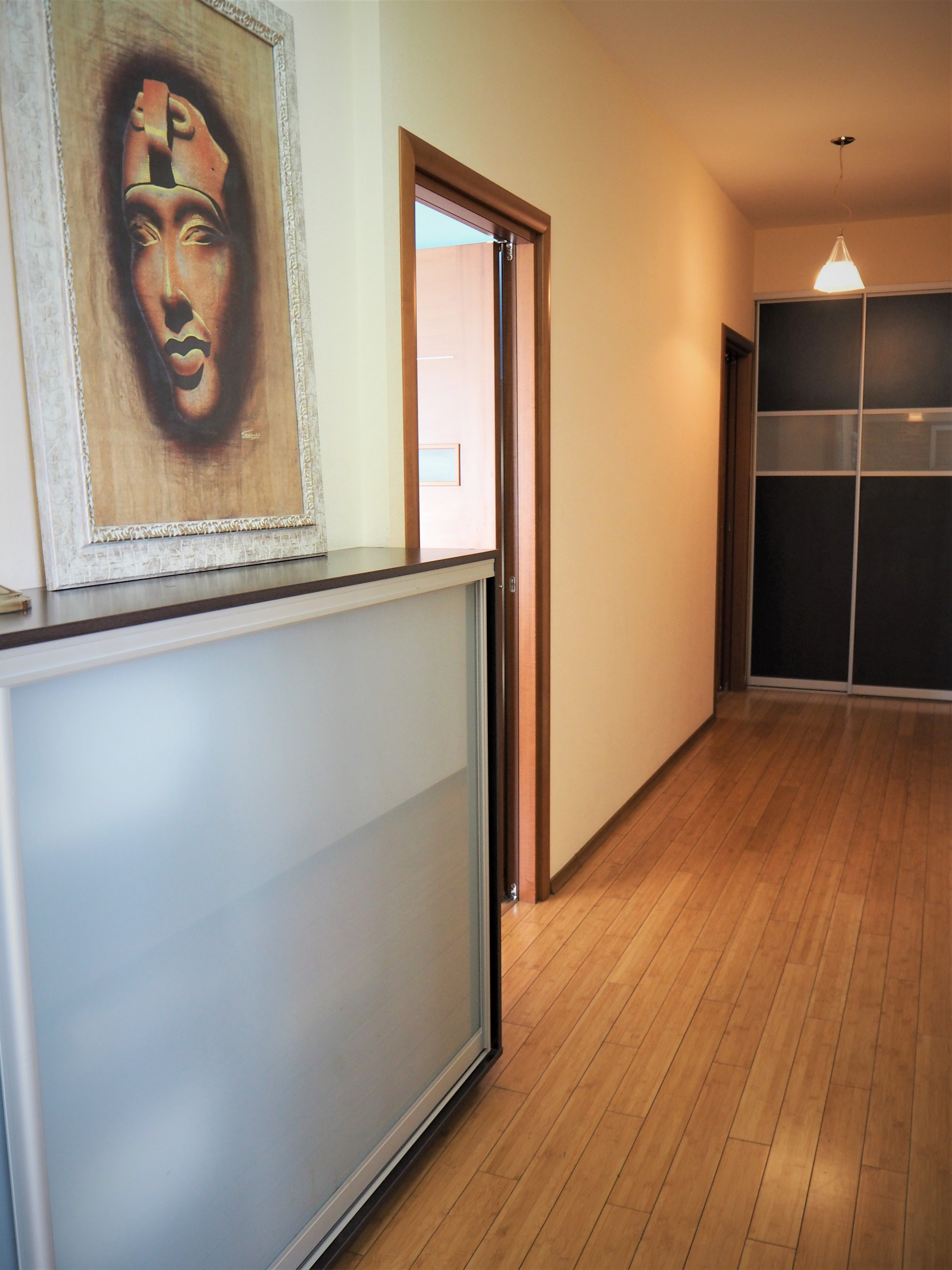 Ремонт сделан по индивидуальному дизайн-проекту из материалов премиум-сегмента: бамбуковая паркетная доска, итальянский и испанский керамогранит, кухонный гарнитур с итальянскими фасадами из натурального дерева, теплые полы.