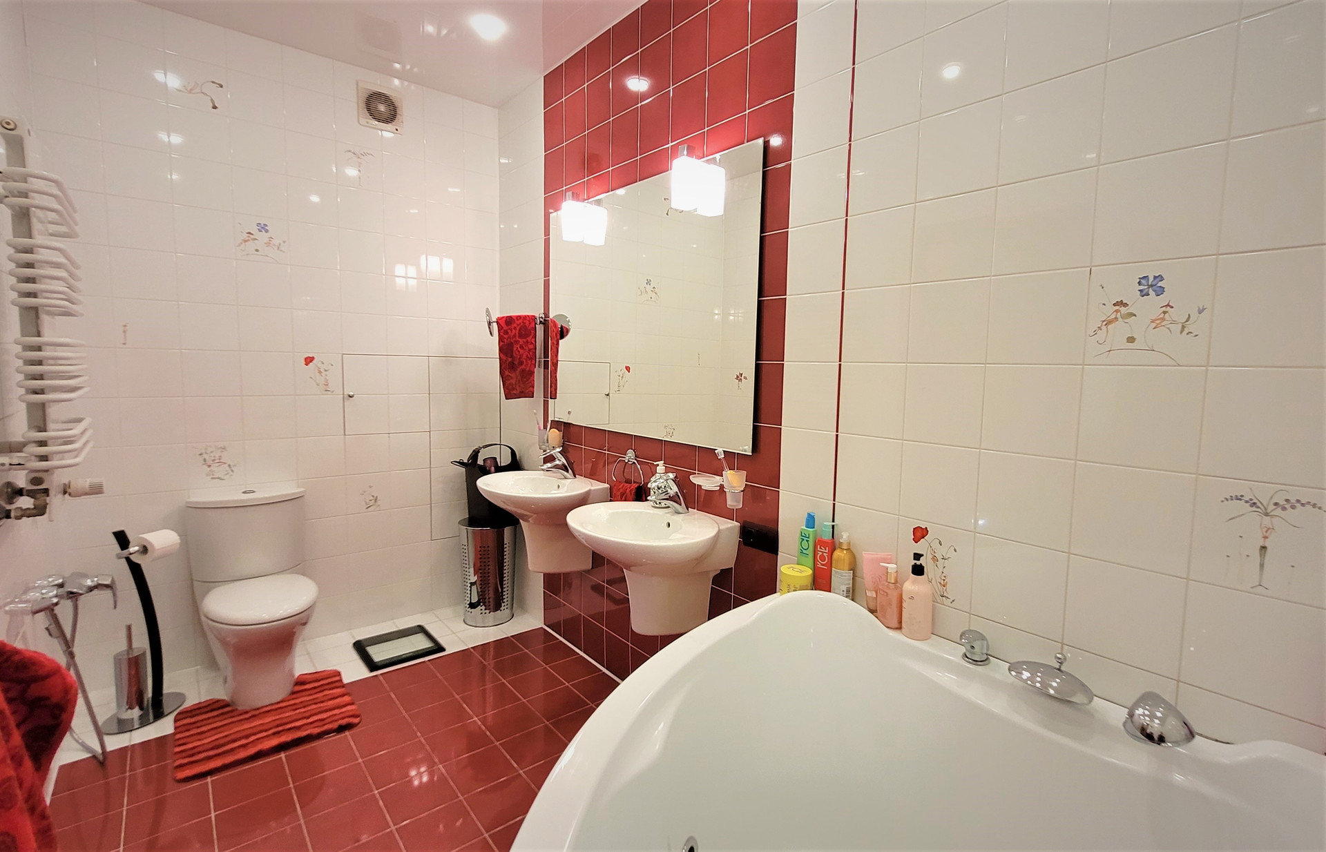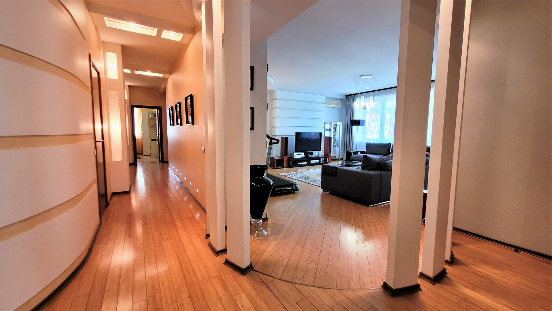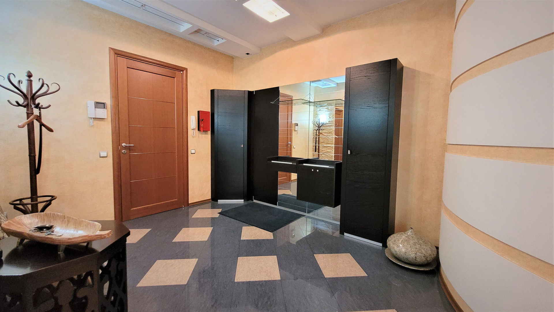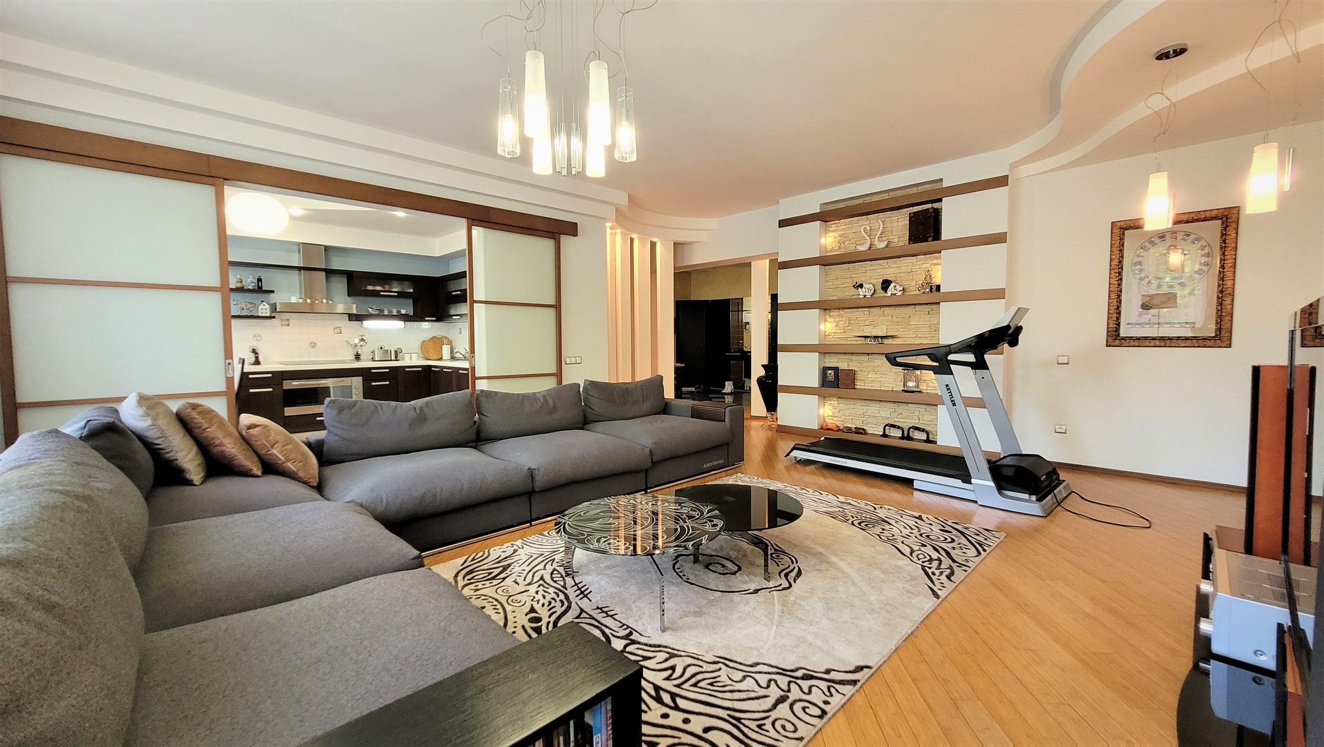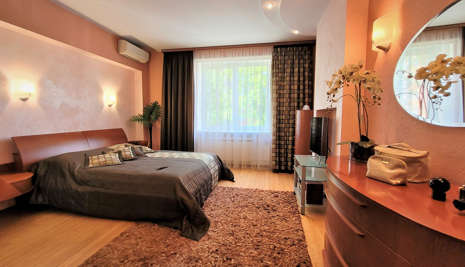 Ремонт сделан по индивидуальному дизайн-проекту из материалов премиум-сегмента: бамбуковая паркетная доска, итальянский и испанский керамогранит, кухонный гарнитур с итальянскими фасадами из натурального дерева, теплые полы.
