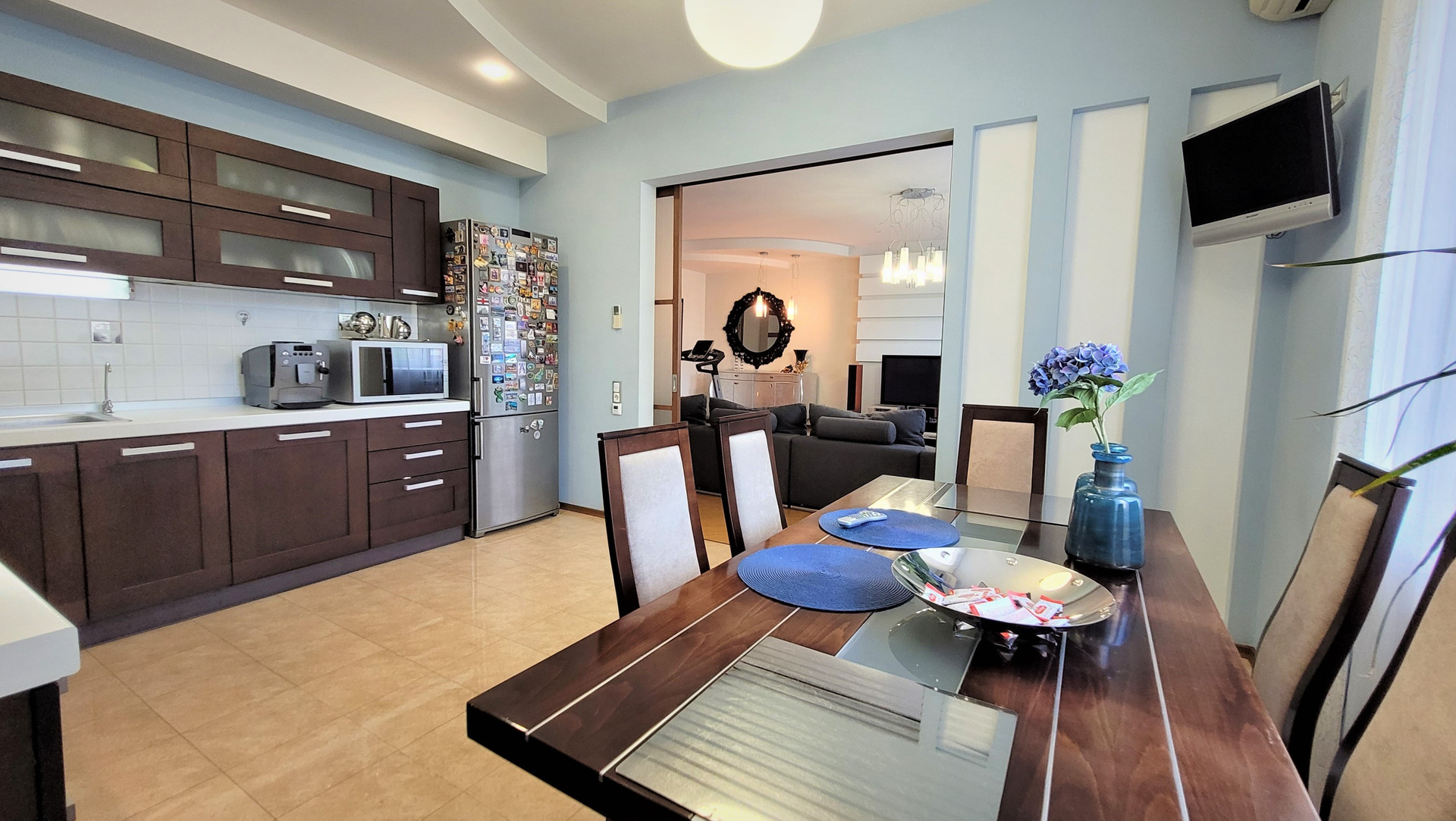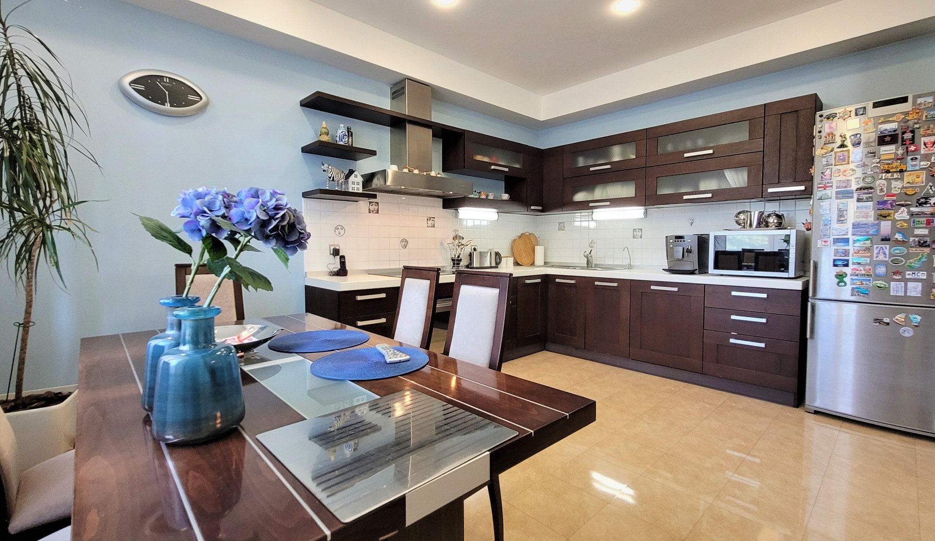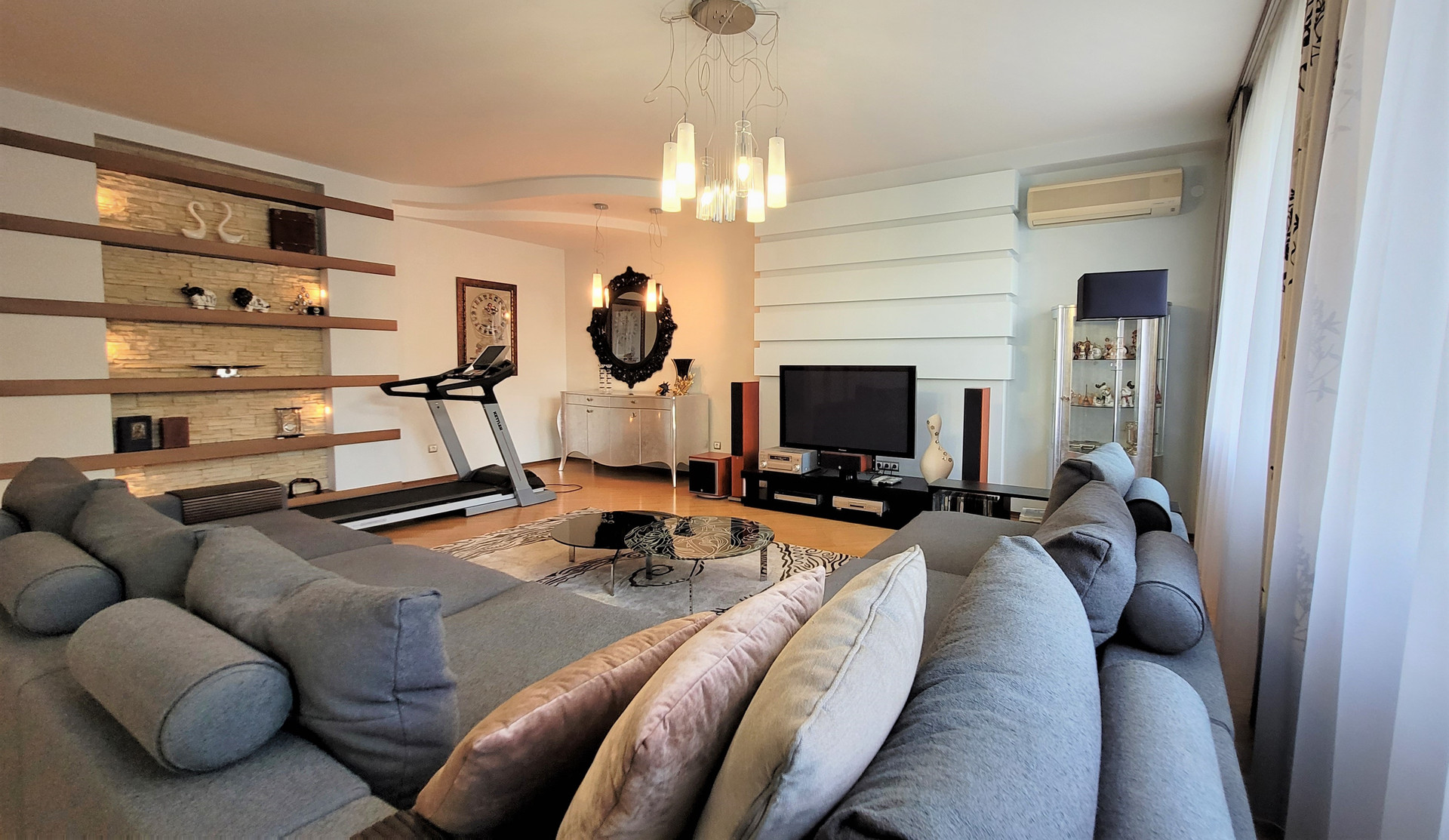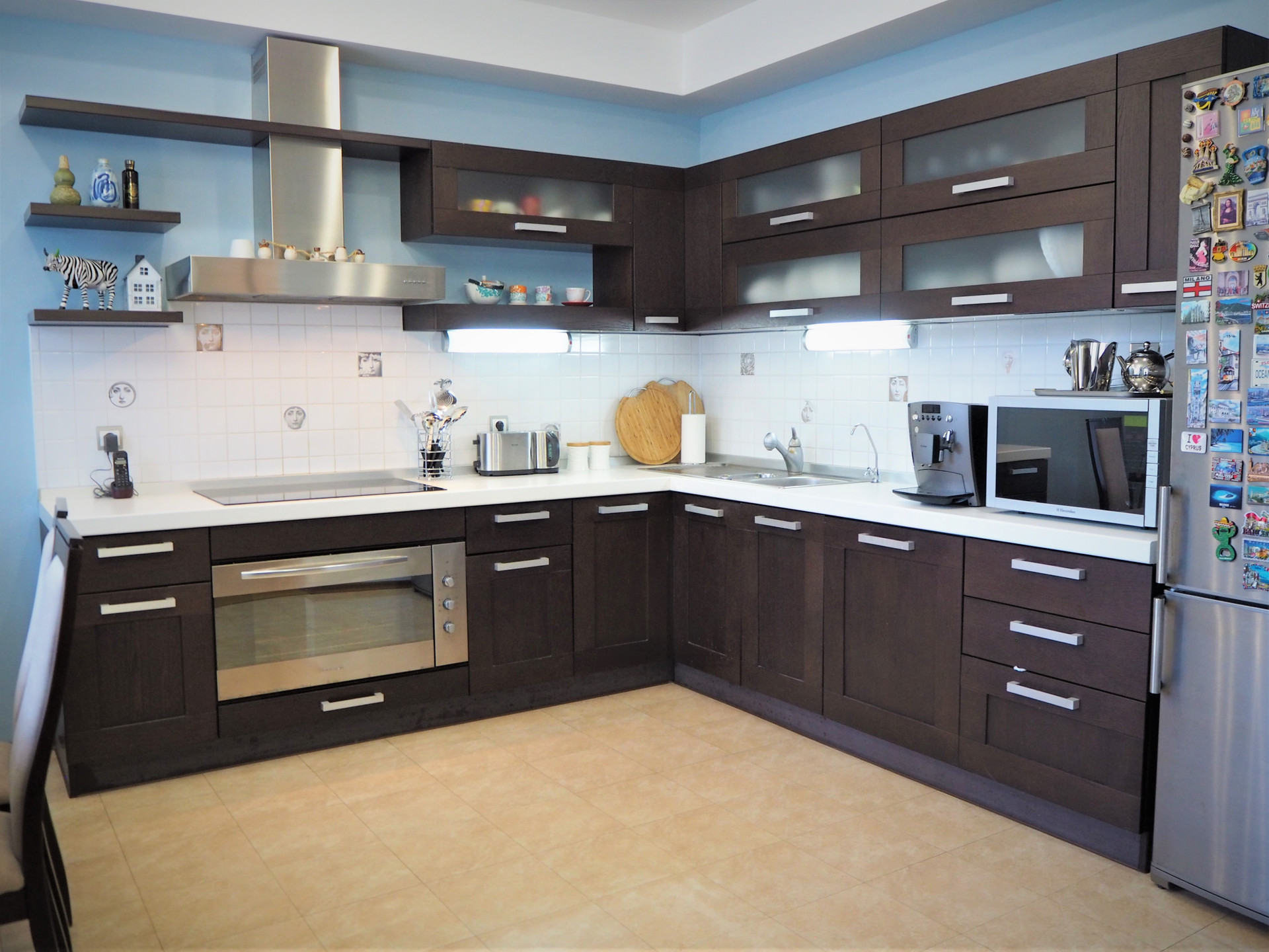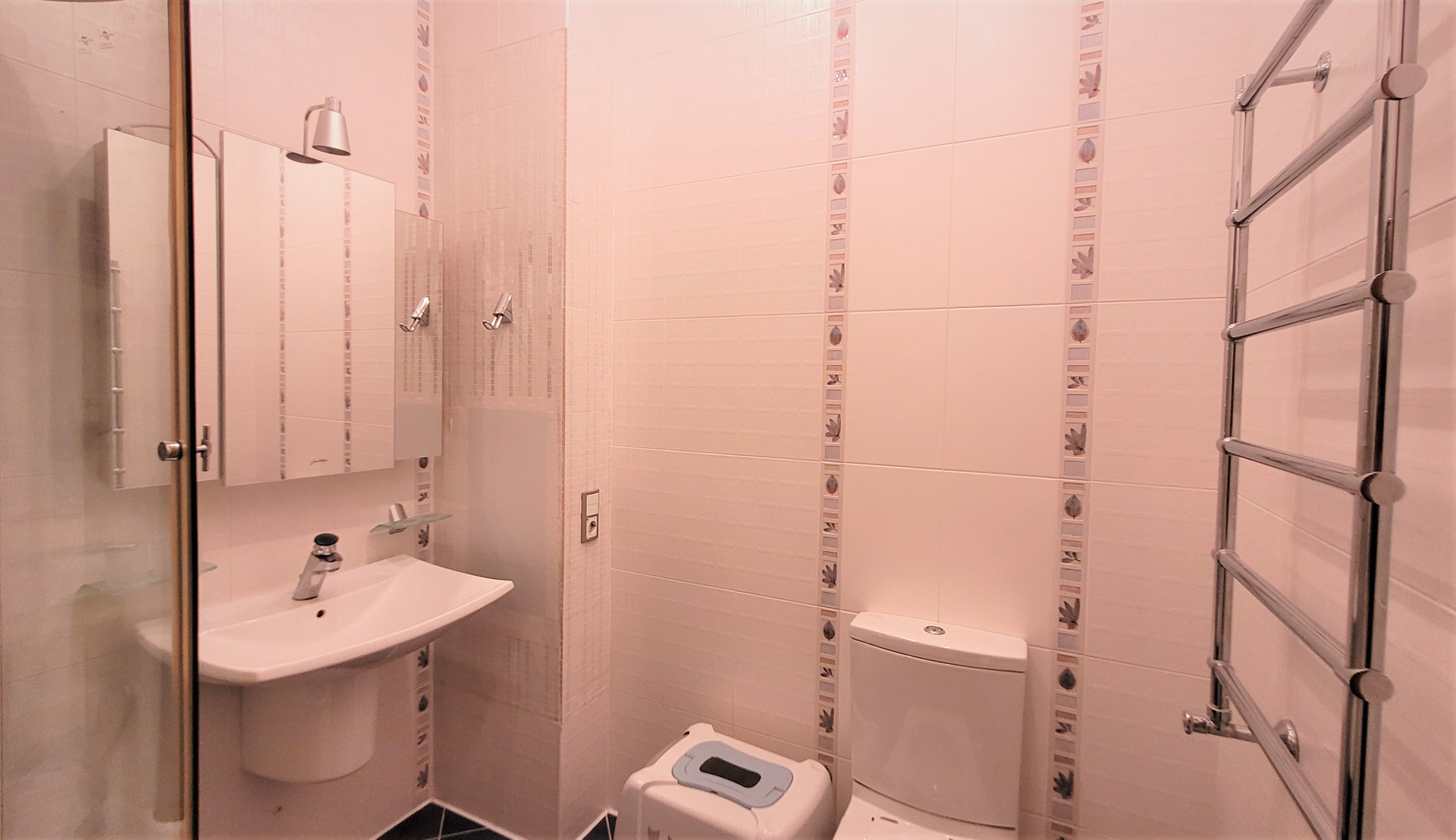 Ремонт сделан по индивидуальному дизайн-проекту из материалов премиум-сегмента: бамбуковая паркетная доска, итальянский и испанский керамогранит, кухонный гарнитур с итальянскими фасадами из натурального дерева, теплые полы.