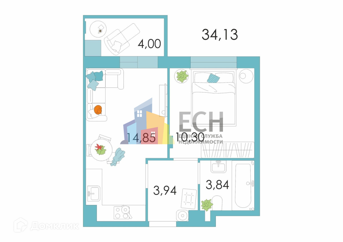 Общая площадь 34.13 м2