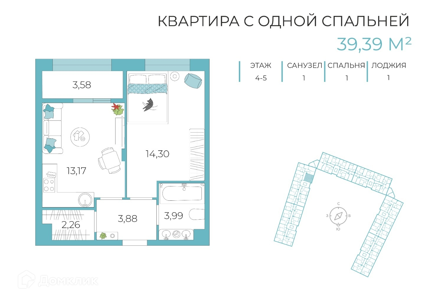 Общая площадь 39.4 м2