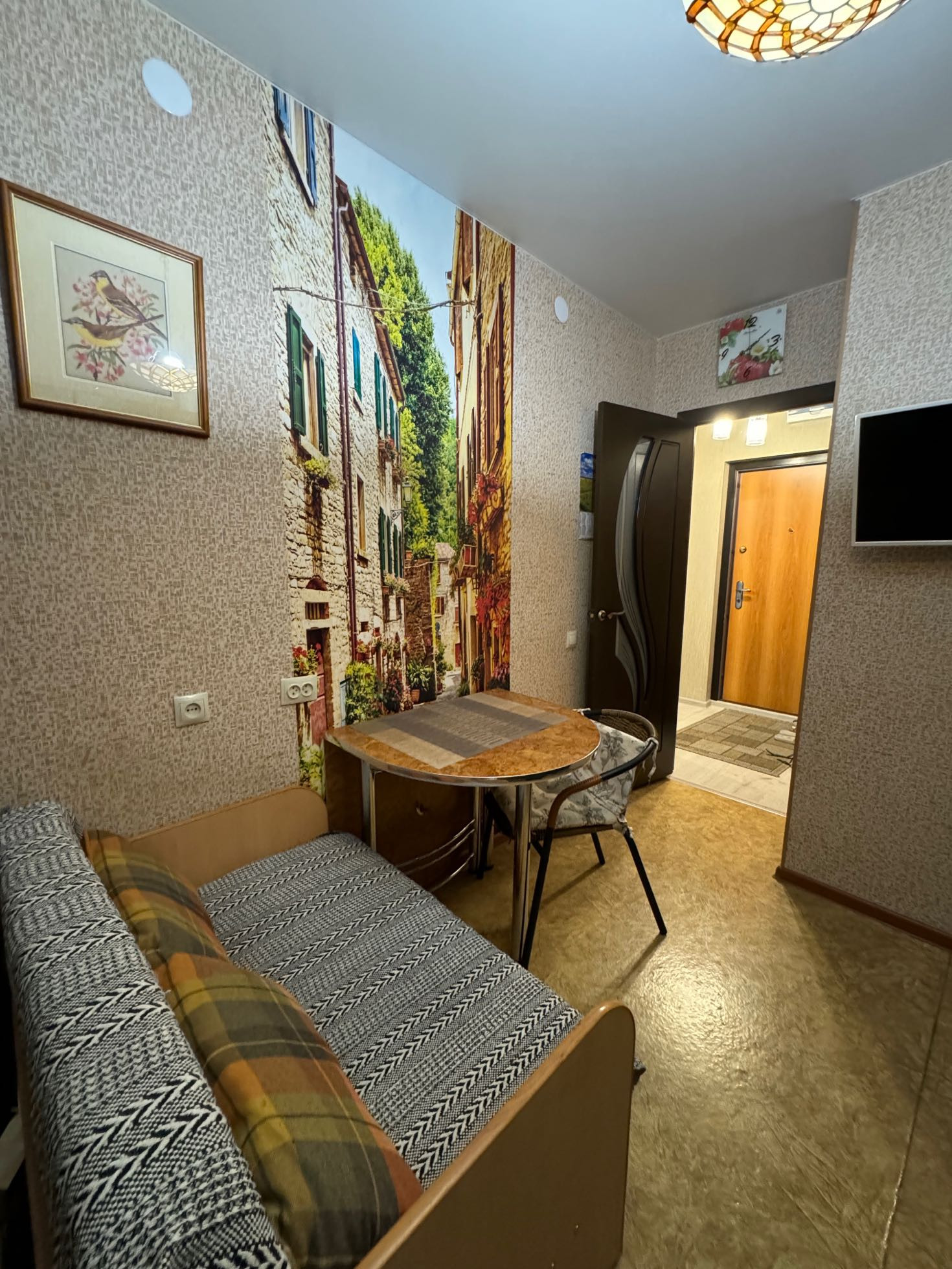 Квартира имеет одну комнату и совмещённый санузел. Из окон открывается прекрасный вид на двор и улицу, благодаря чему в помещении всегда много света. Балкон добавляет дополнительное пространство для отдыха и возможность наслаждаться свежим воздухом без необходимости выходить из дома.