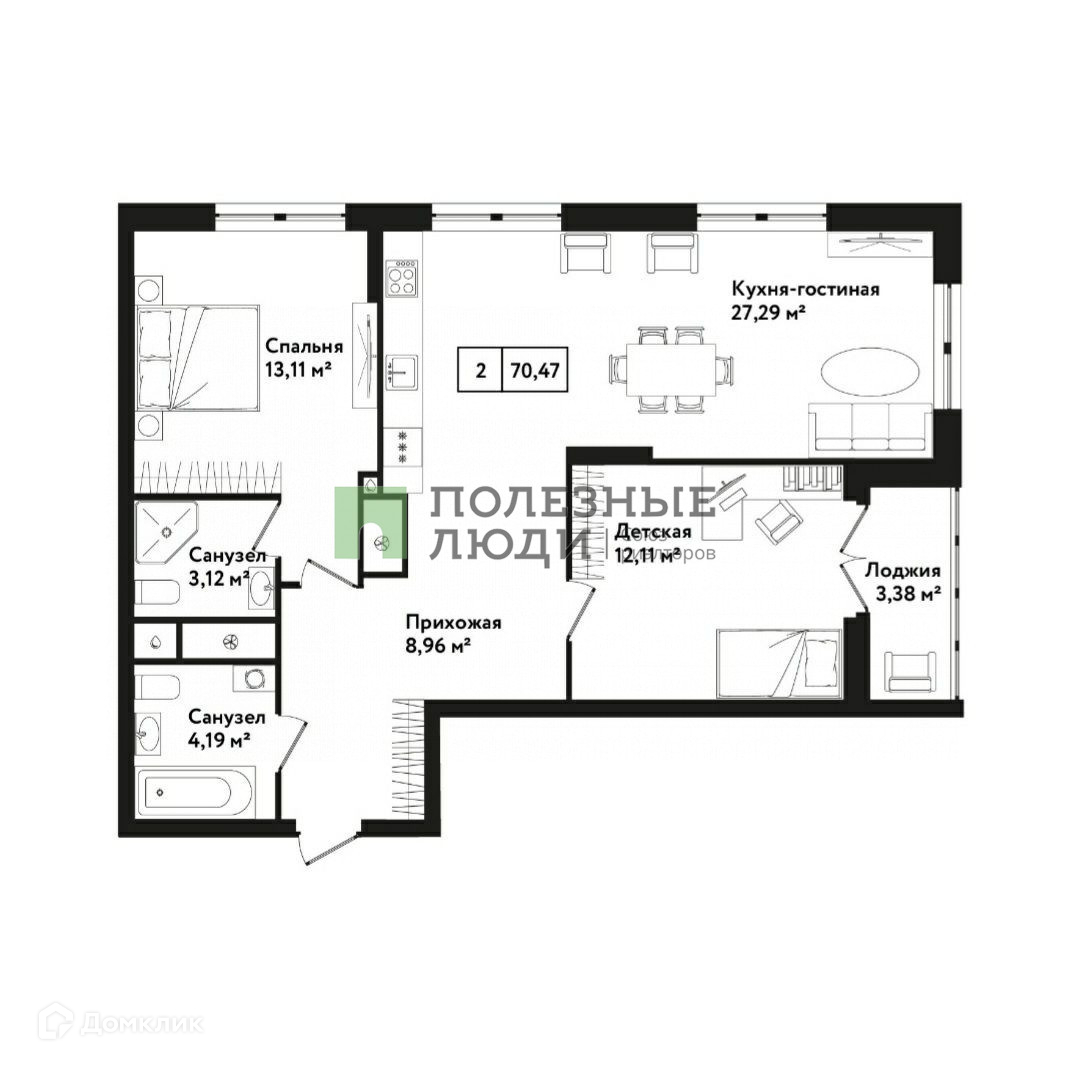 Удобная планировка: 3 окна в кухне-гостиной, что позволит разделить кухню и сделать дополнительную 3-ю комнату.