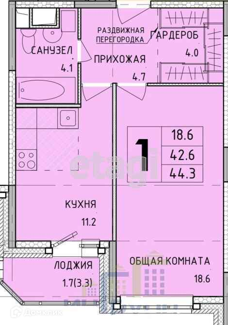 Общая площадь 44.3 м2