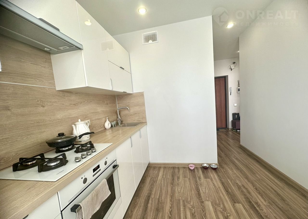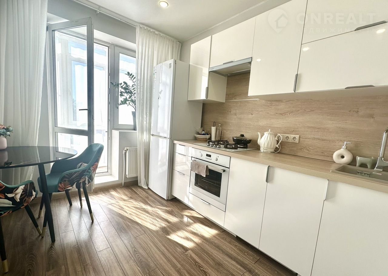 Просторная кухня оснащена встроенным кухонным гарнитуром, который останется будущим хозяевам!