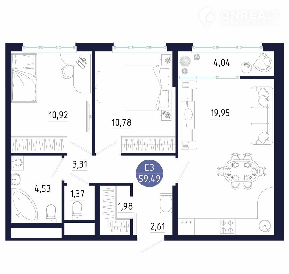 Общая площадь 59.5 м2