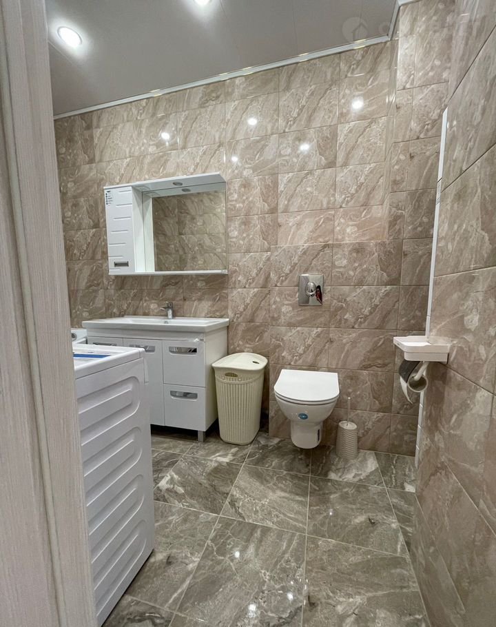 Просторный совместный санузел "в плитке", полноценная огромная угловая ванная, стиральная машинка, унитаз-инсталляция.