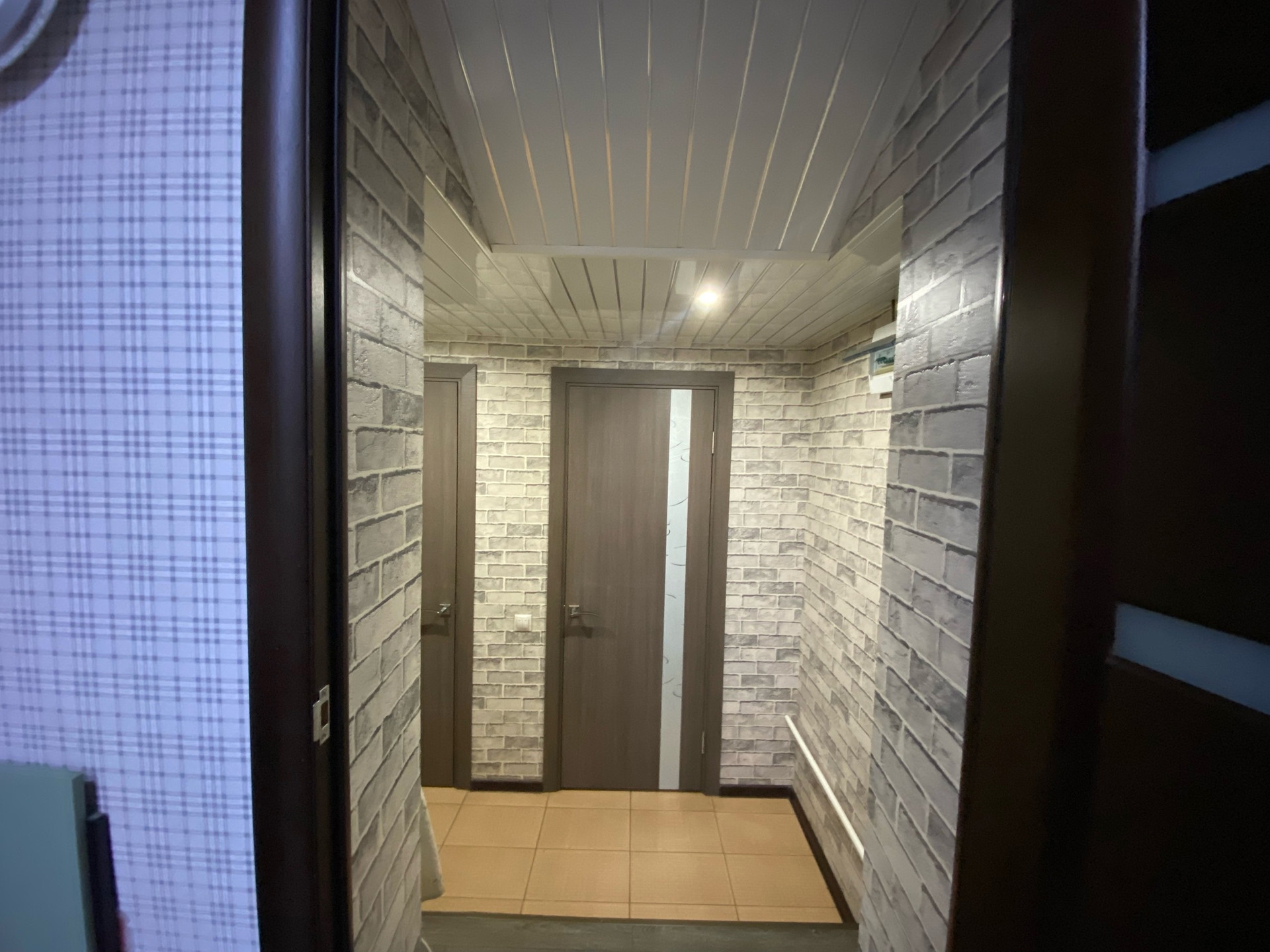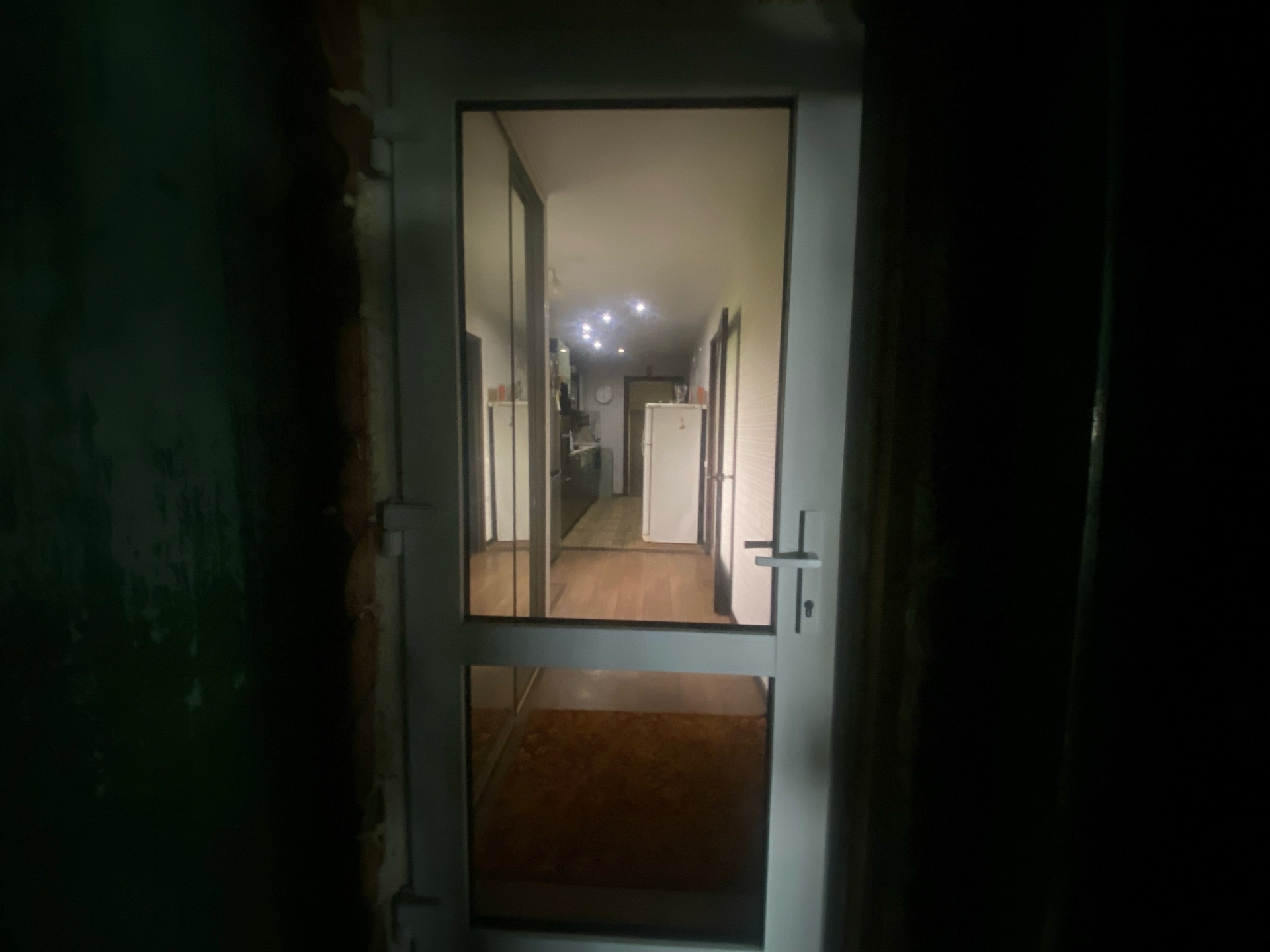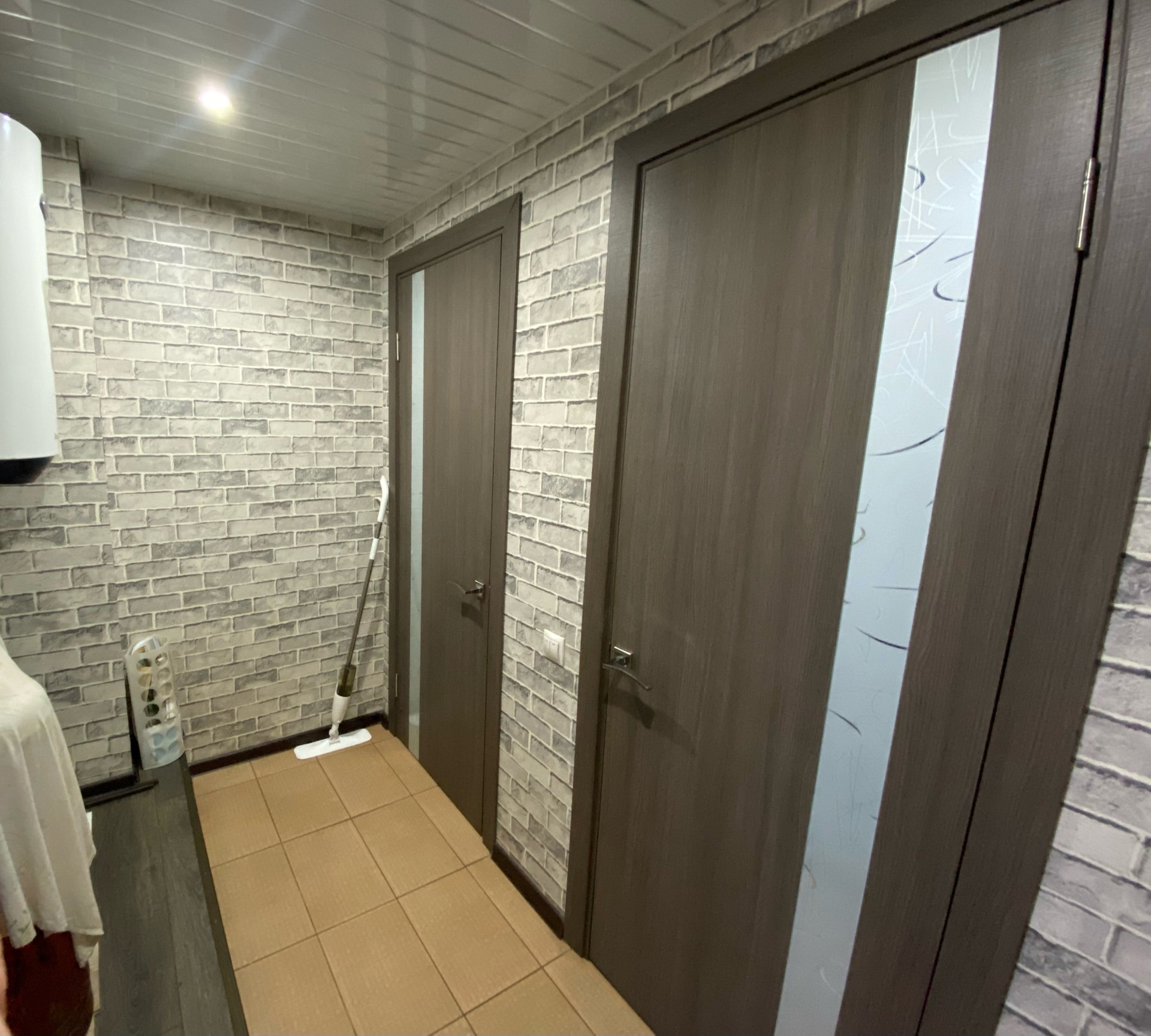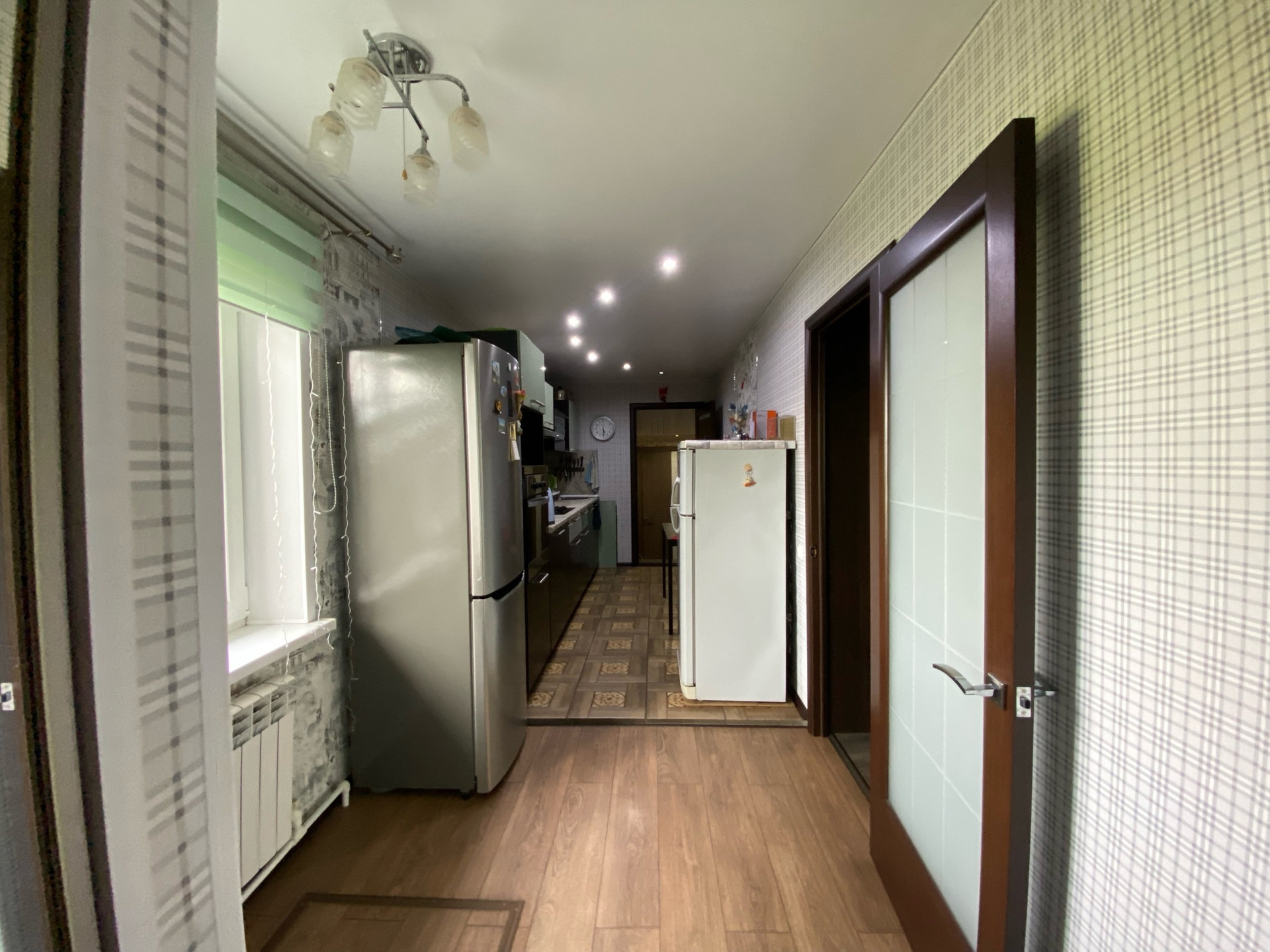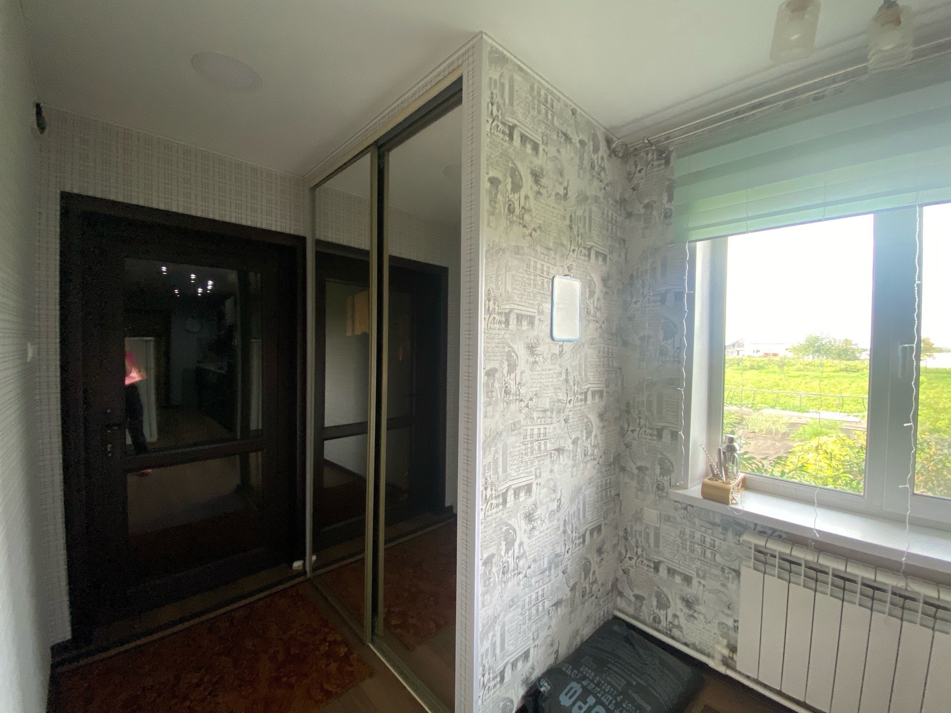 В коридоре две гардеробные. (Для одежды и обуви). С зеркалами в пол. Входная дверь стеклянная.