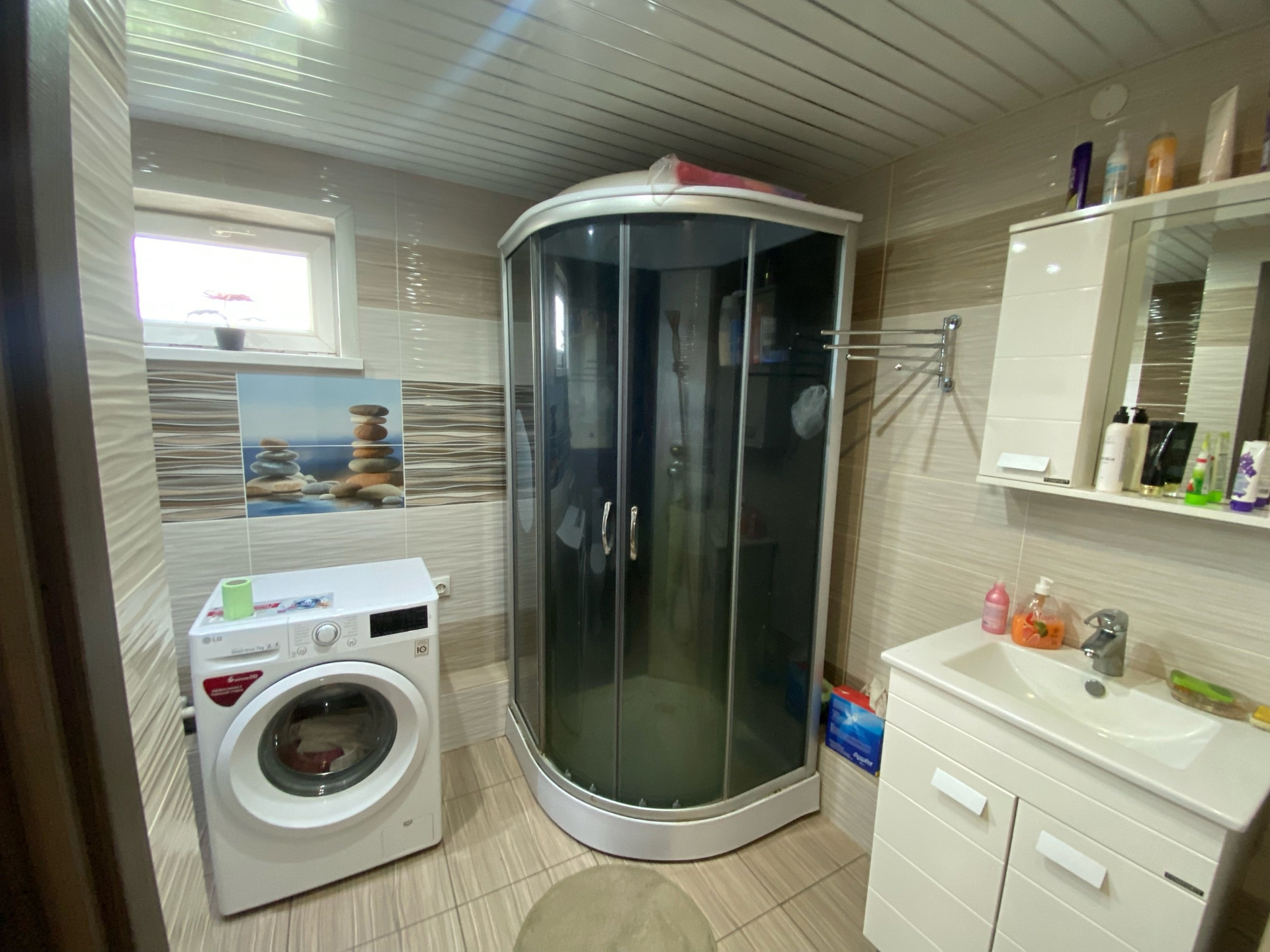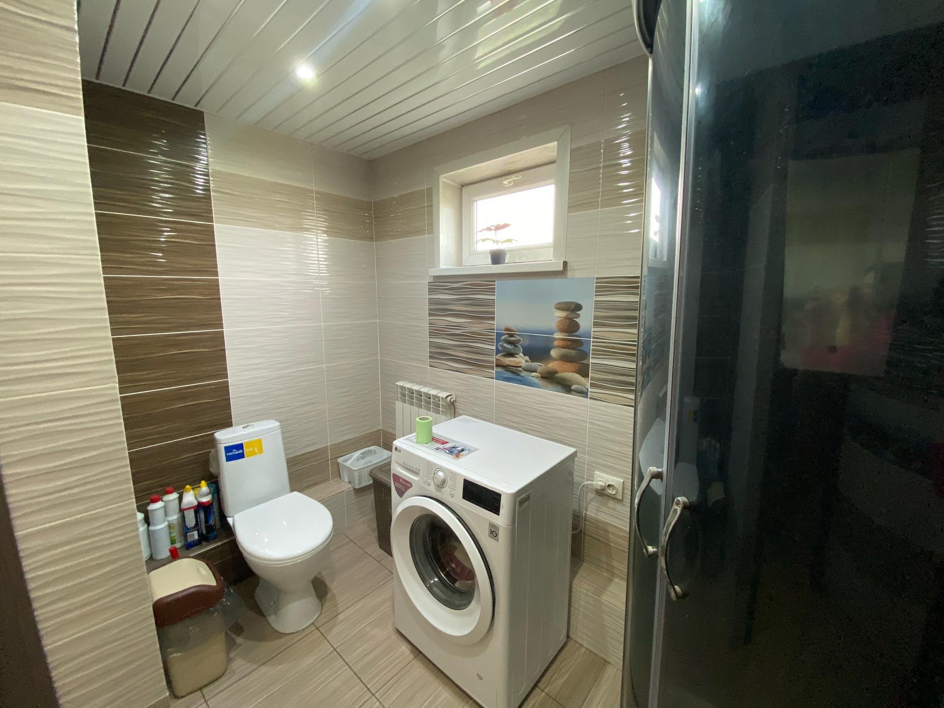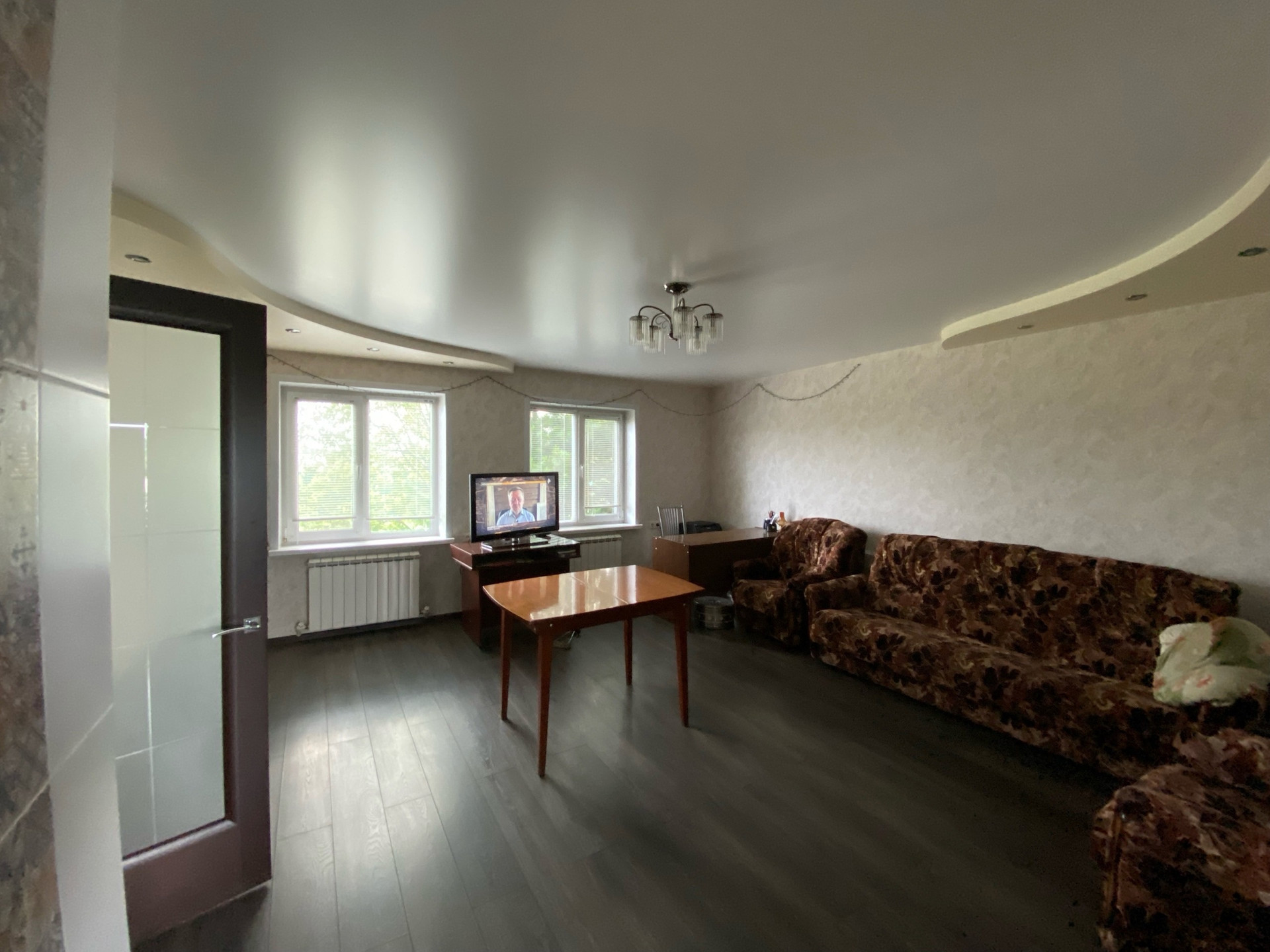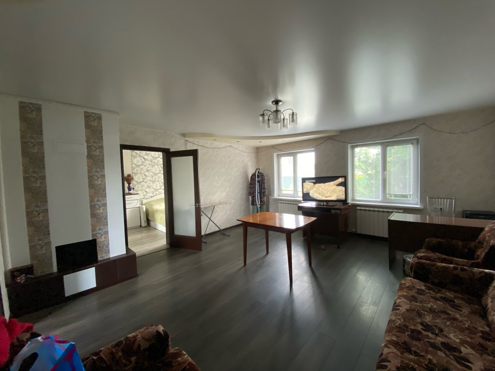В доме произведен дизайнерский ремонт. Натяжные потолки, в большой комнате двухуровневый натяжной потолок. Теплый пол в душевой комнате (санузел совмещен) и на кухне. Современные обои, пластиковые окна, межкомнатные двери все в одном стиле. По договоренности остается частично мебель (Кухонный гарнитур, вытяжка, газово-электрическая плита, встроенная посудомоечная машина).