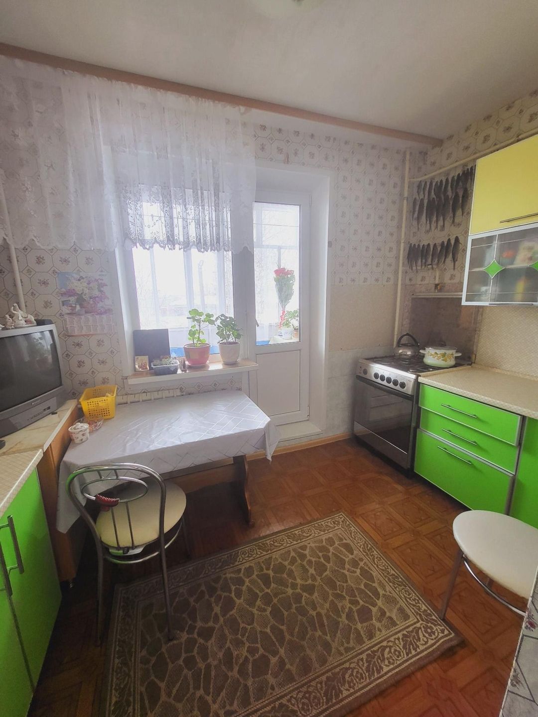 не угловая, окна пвх, лоджия остеклена деревом выход с кухни, в комнате установлен натяжной потолок,  поменены межкомнатные двери,  ванная комната отделка панелями,
