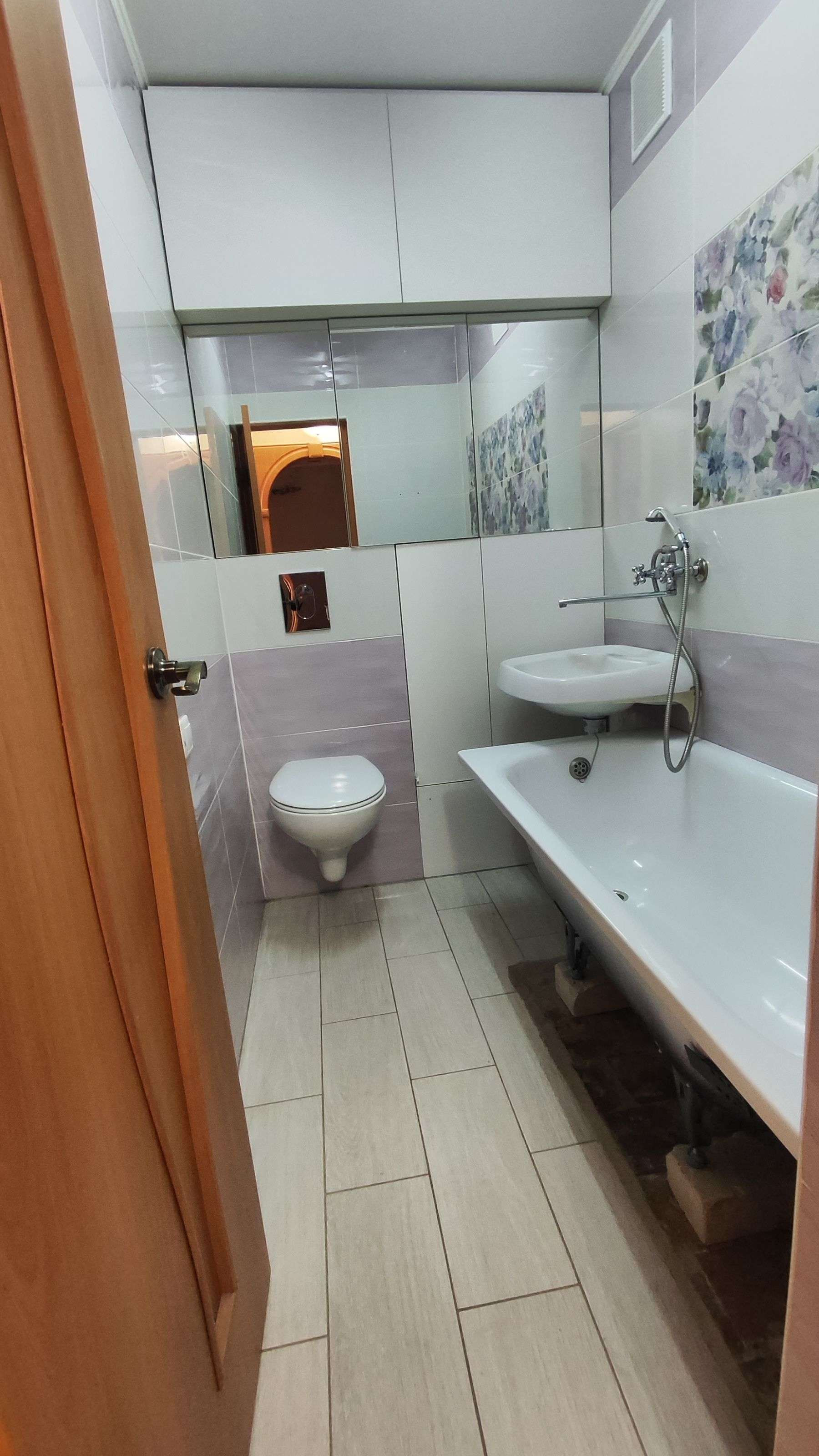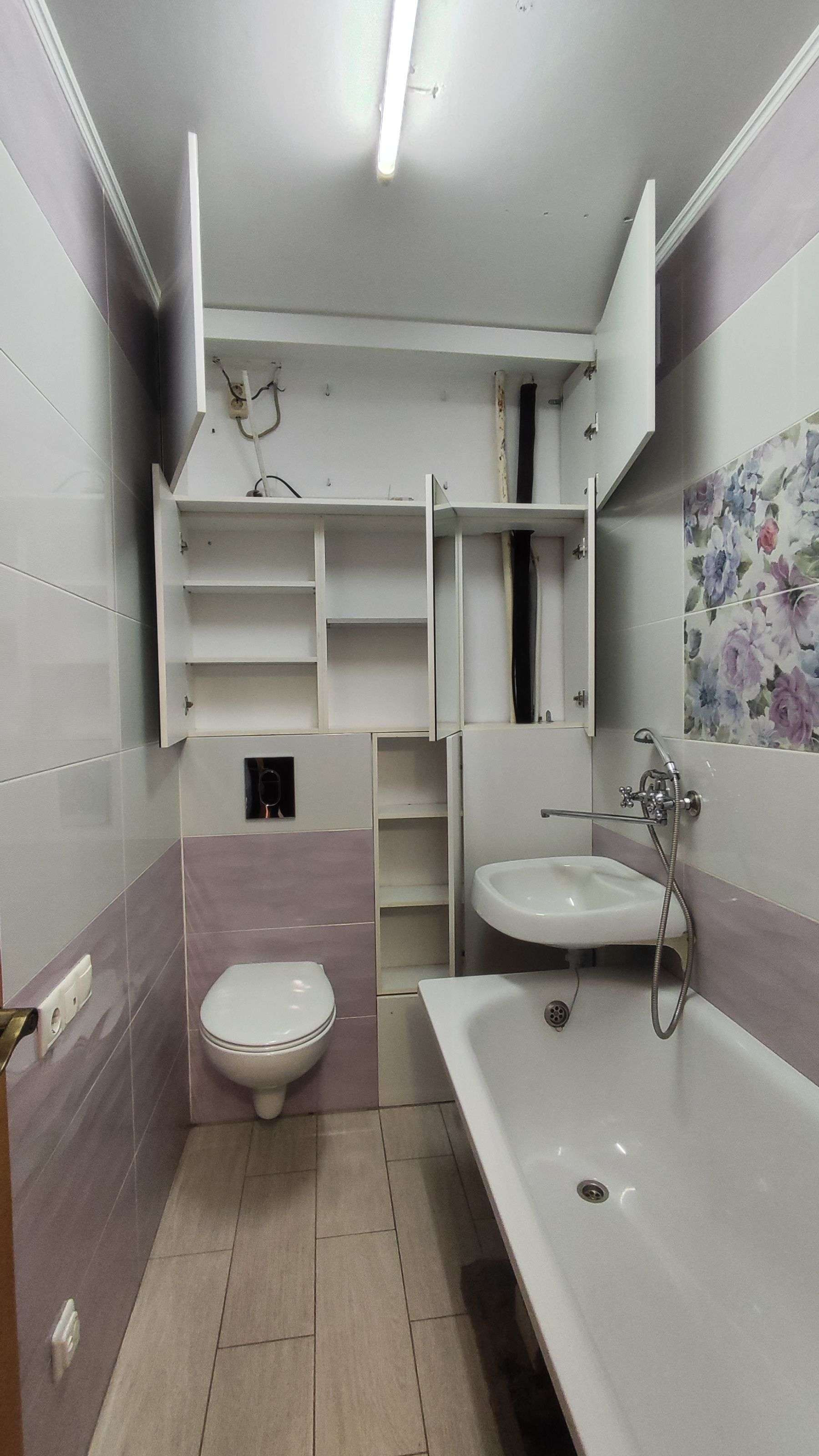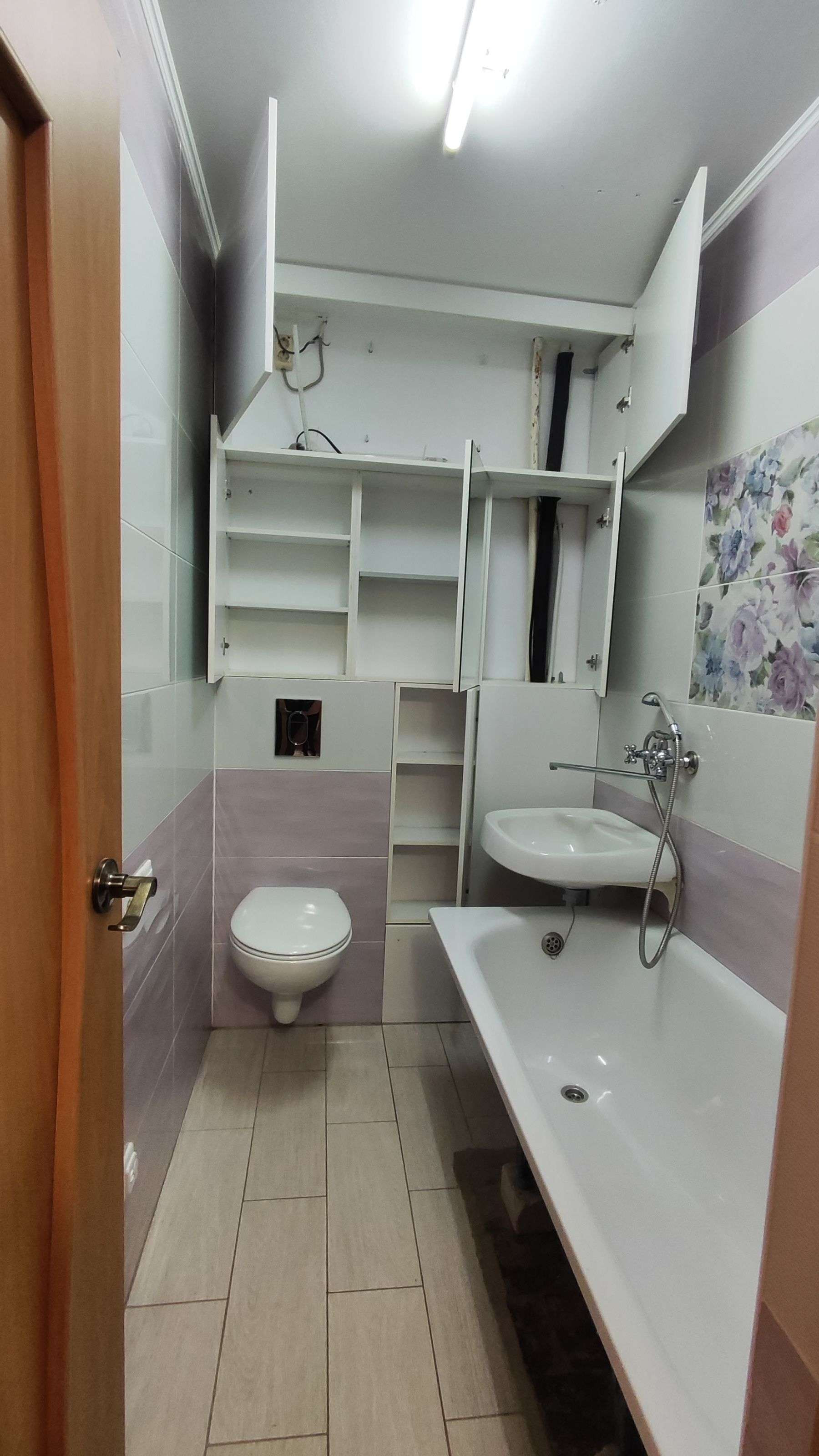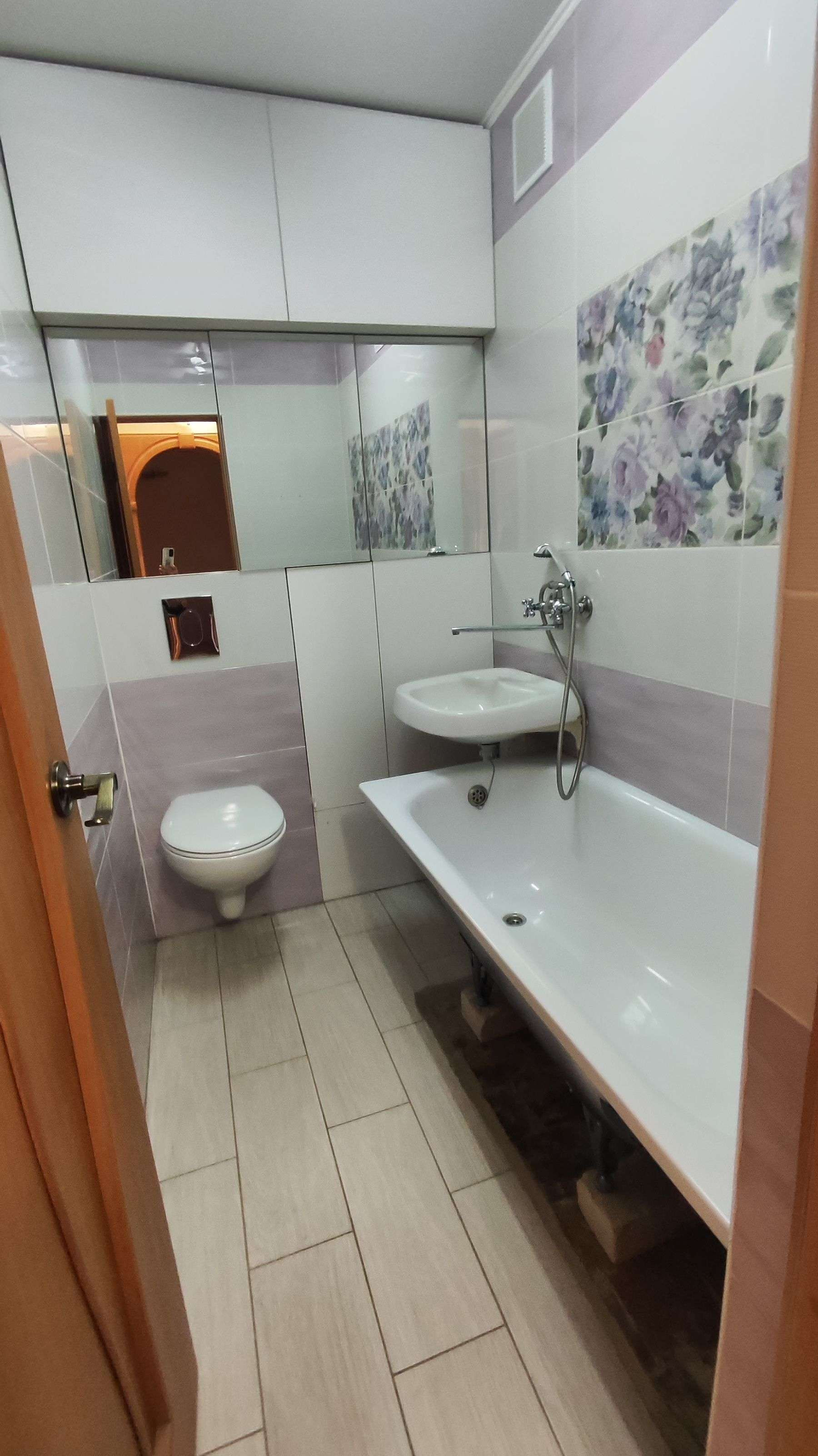 - ремонт в санузле: качественная сантехника, современная плитка,  унитаз с инсталляцией подвесной, вместительные шкафчики.