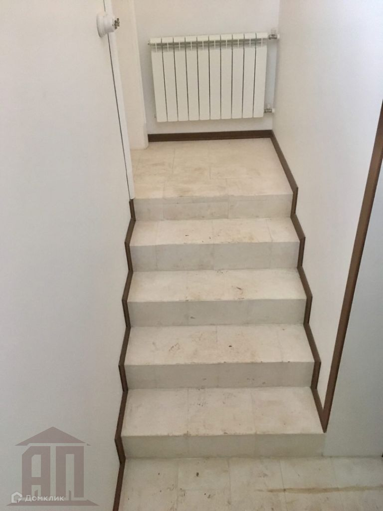 Цокольный этаж из белого камня и кирпича.   Ступеньки сделанны из белого извесняка.