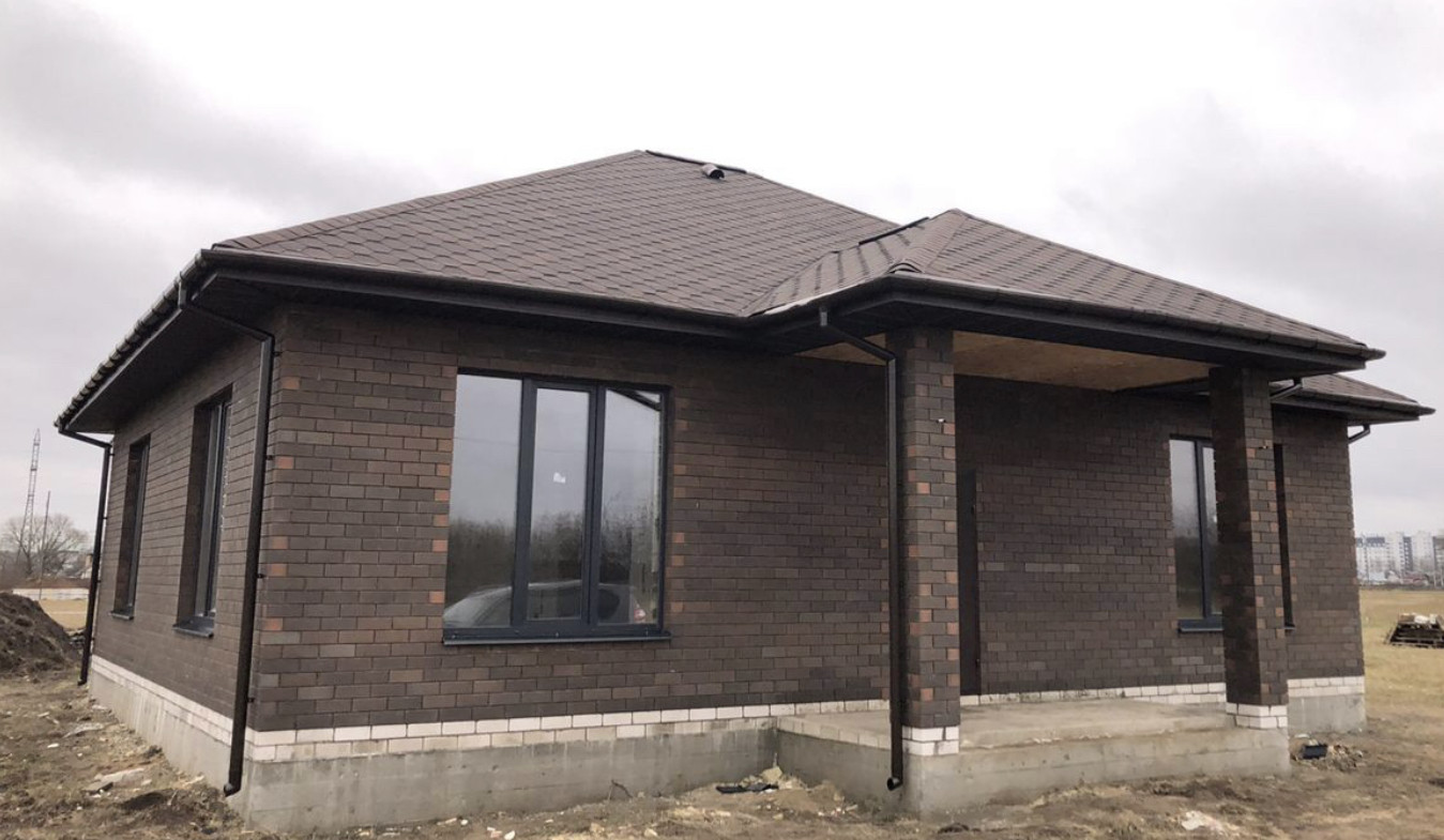 Дом построен из качественных материалов: фундамент плита, стены газосиликат Могилёв, утеплитель Пеноплекс, облицовка Вышневолоцкая керамика (Баварская кладка), крыша мягкая кровля. Утеплённые по потолку 200 мм. Окна Рехау 60 с ламинацией Антрацитово-серый.