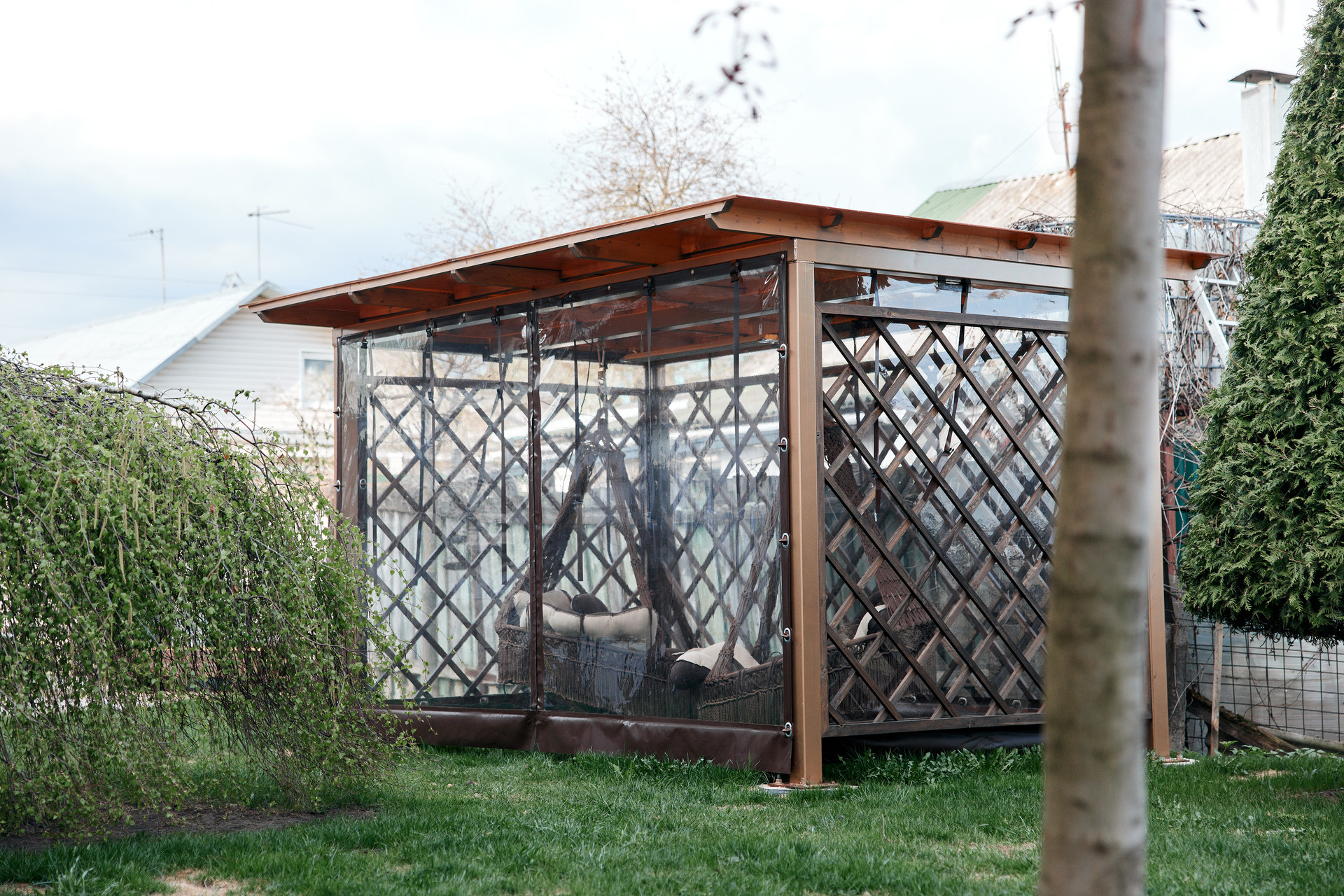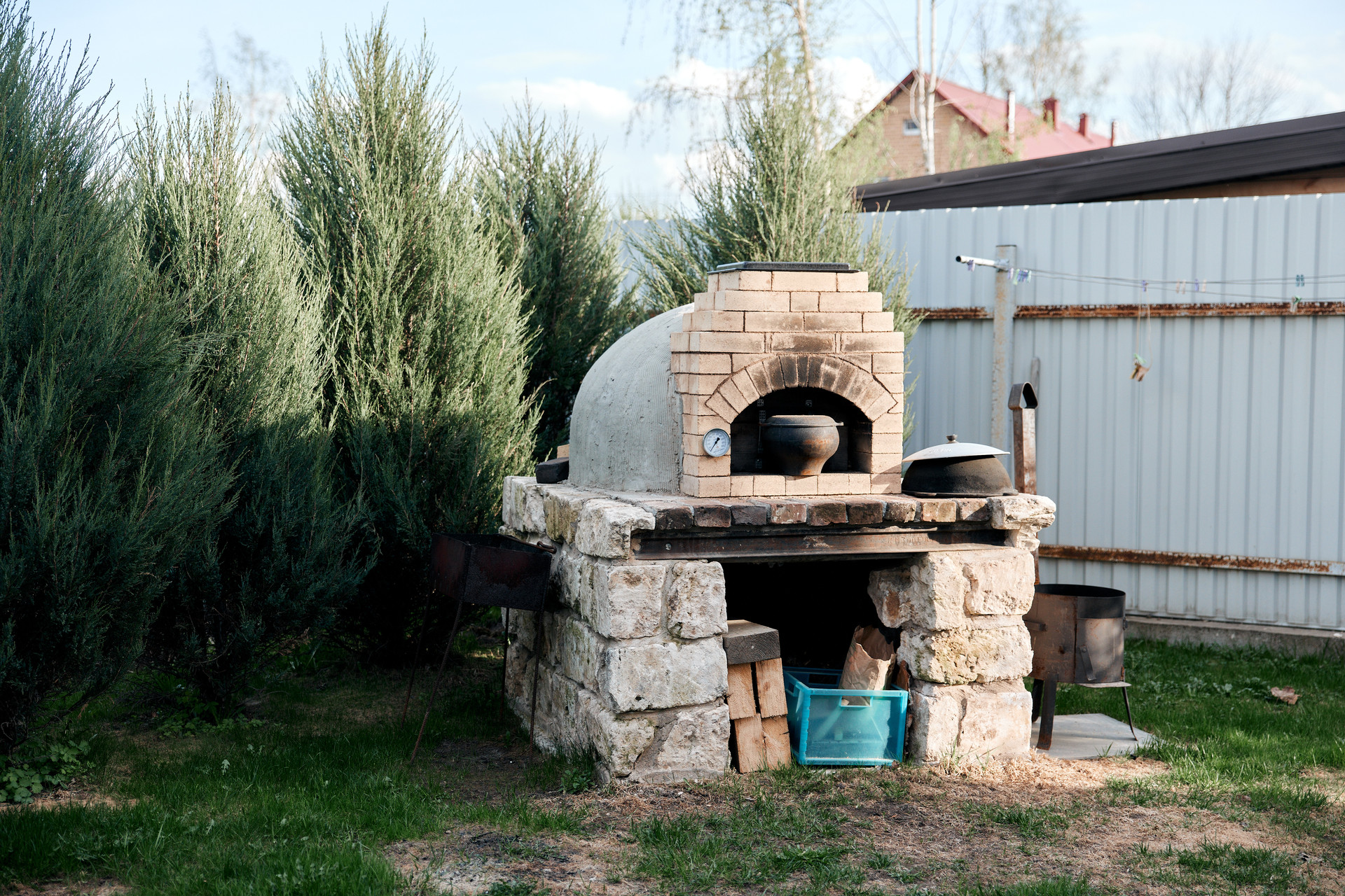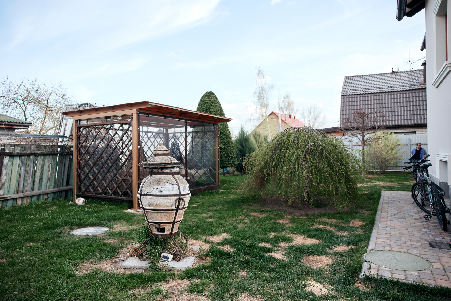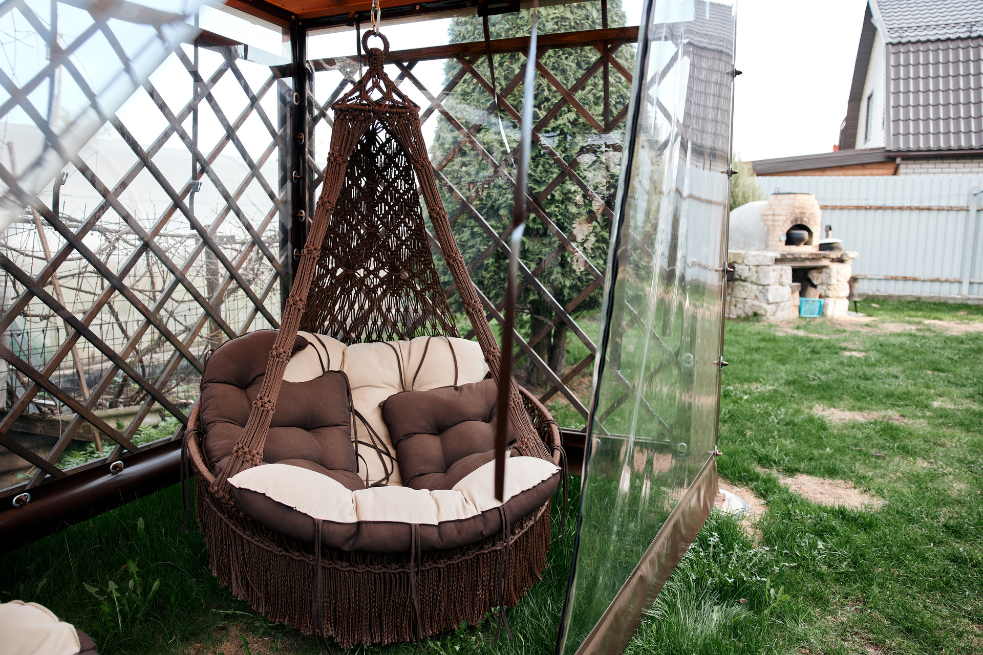 Также на участке беседка с остеклением "жидкое стекло", зона барбекю: русская печь по индивидуальному проекту, тандыр.
