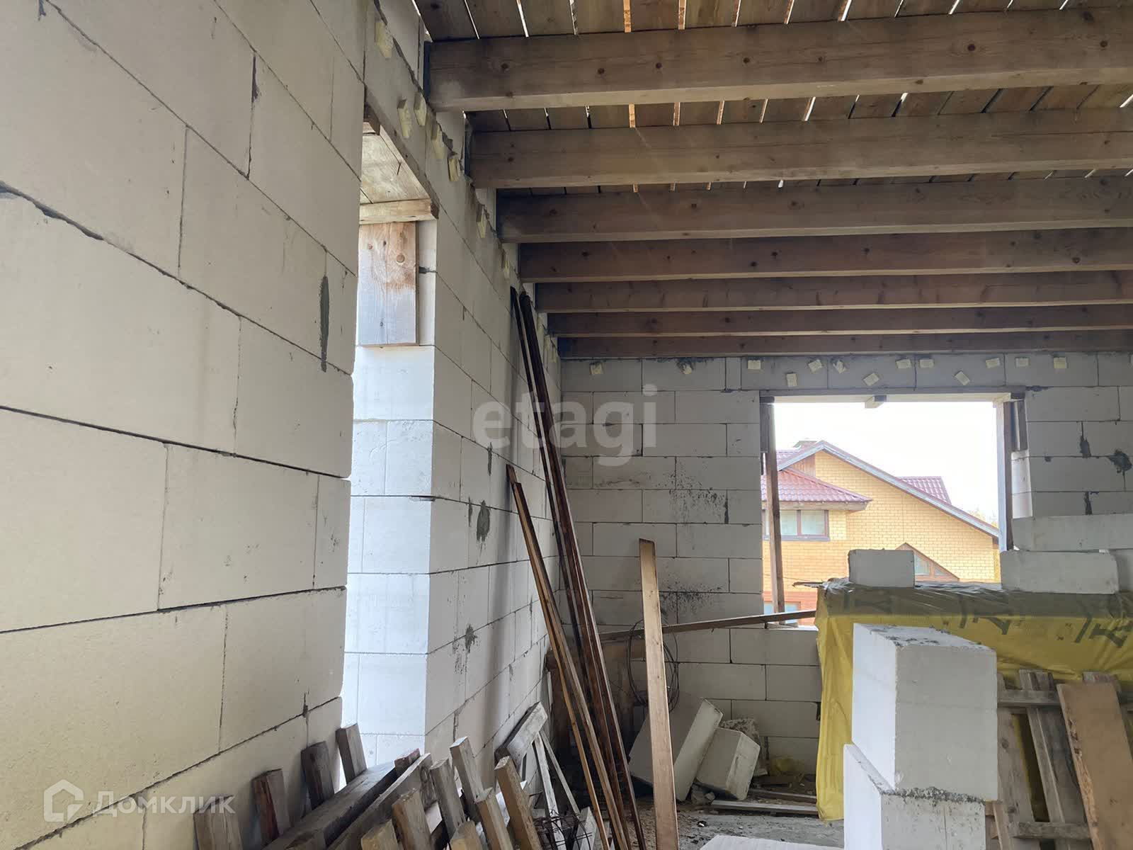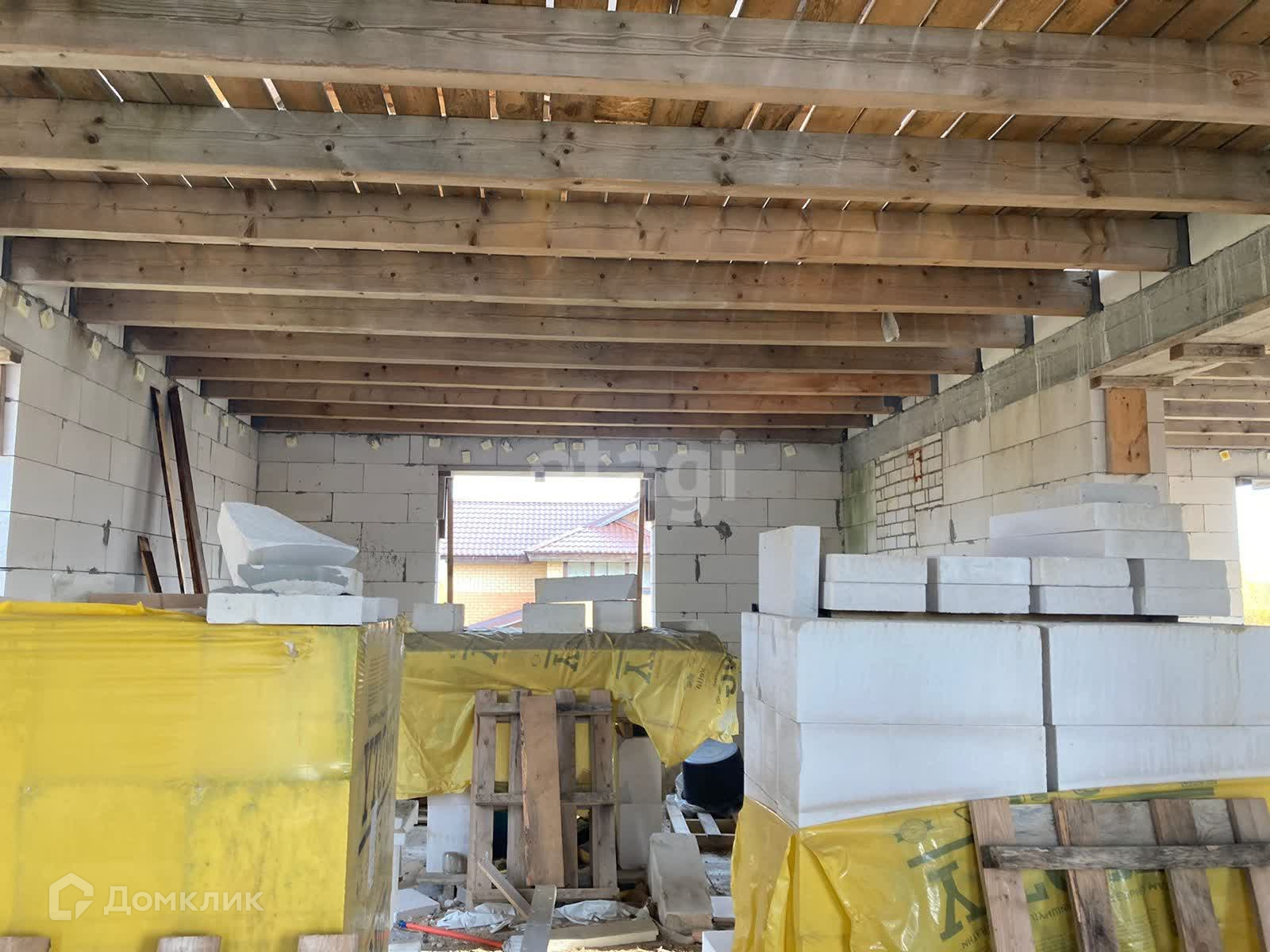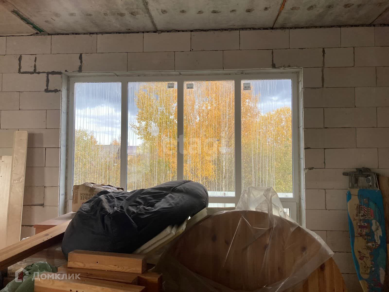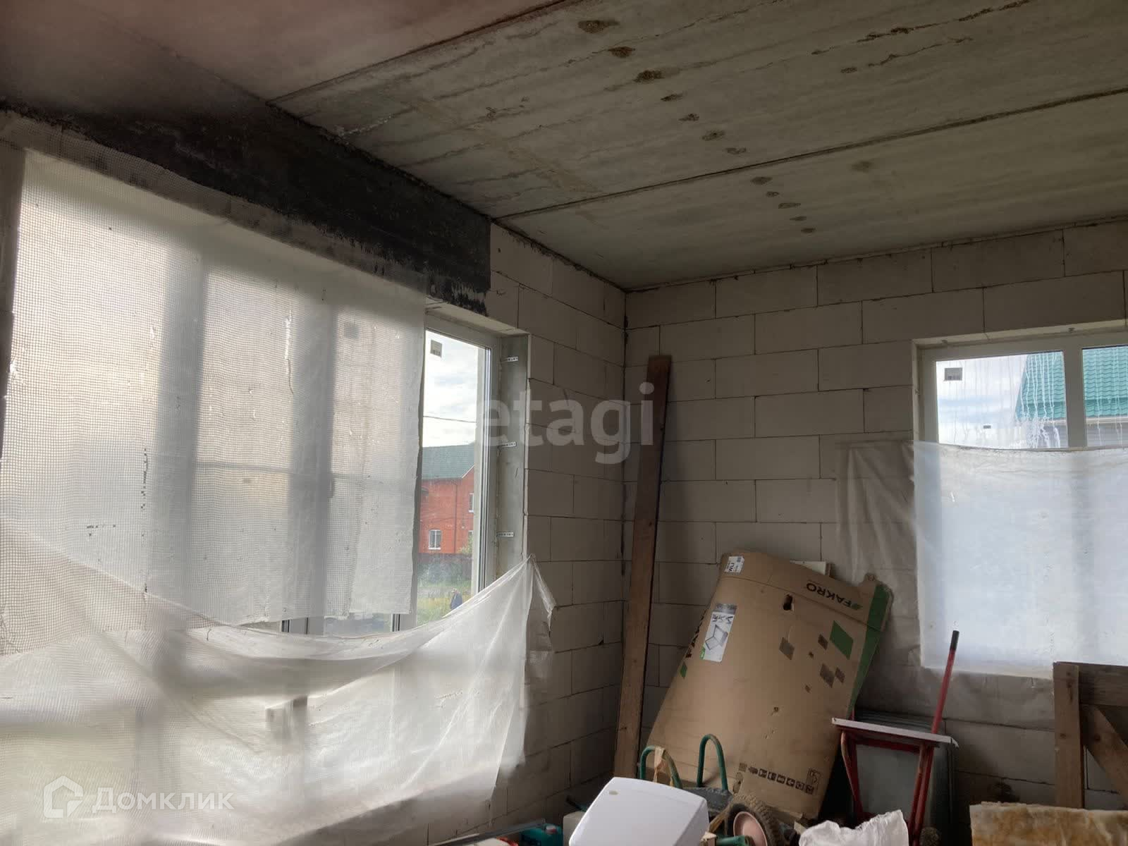 Дом недостроен, но большая часть работы выполнена. Частично остались стройматериалы для завершения строительства. Первый этаж полностью остеклен, окна на второй этаж куплены, но не установлены. Проект дома имеется. По проекту – дом просторный и очень светлый.