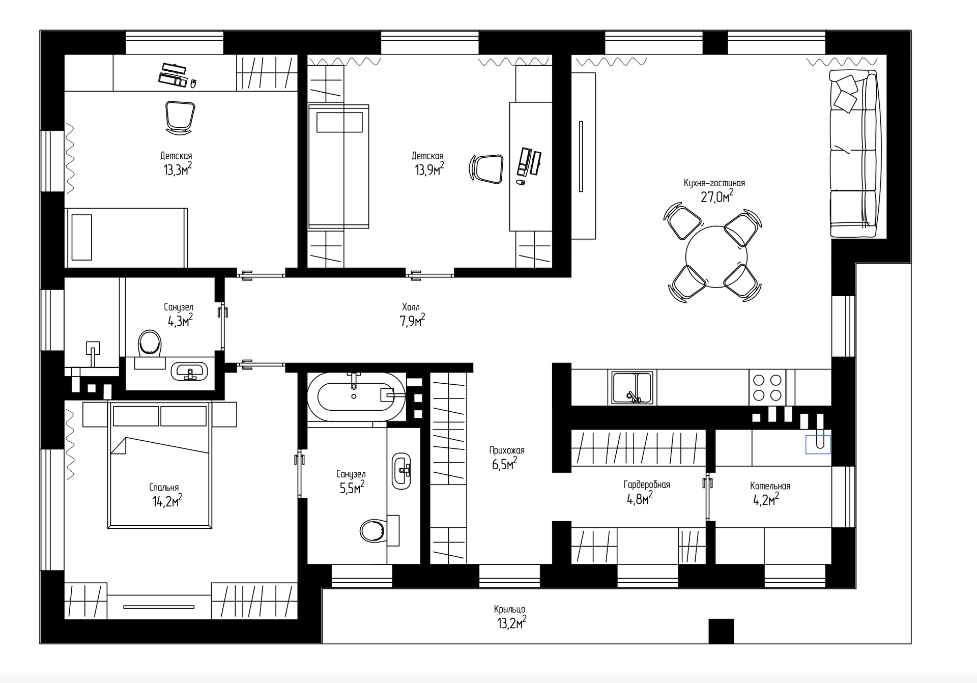 Пространство дома разделено на 2 зоны: просторная кухня-гостиная и большая гардеробная с выделеной прачечной и блок спален из двух детских комнат и родительской мастер-спальней со своей отдельной ванной комнатой. Из гостиной предусмотрено 2 выхода на большую террасу с видом во внутренний двор.