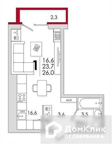 Квартира очень уютная, светлая и теплая общей площадью 26, 0 м2, жилая 16, 6 м2, кухня 7, 1 м2, застекленная лоджия 2, 3 м2, совмещенный санузел 3, 5 м2, прихожая 3, 6 м2.