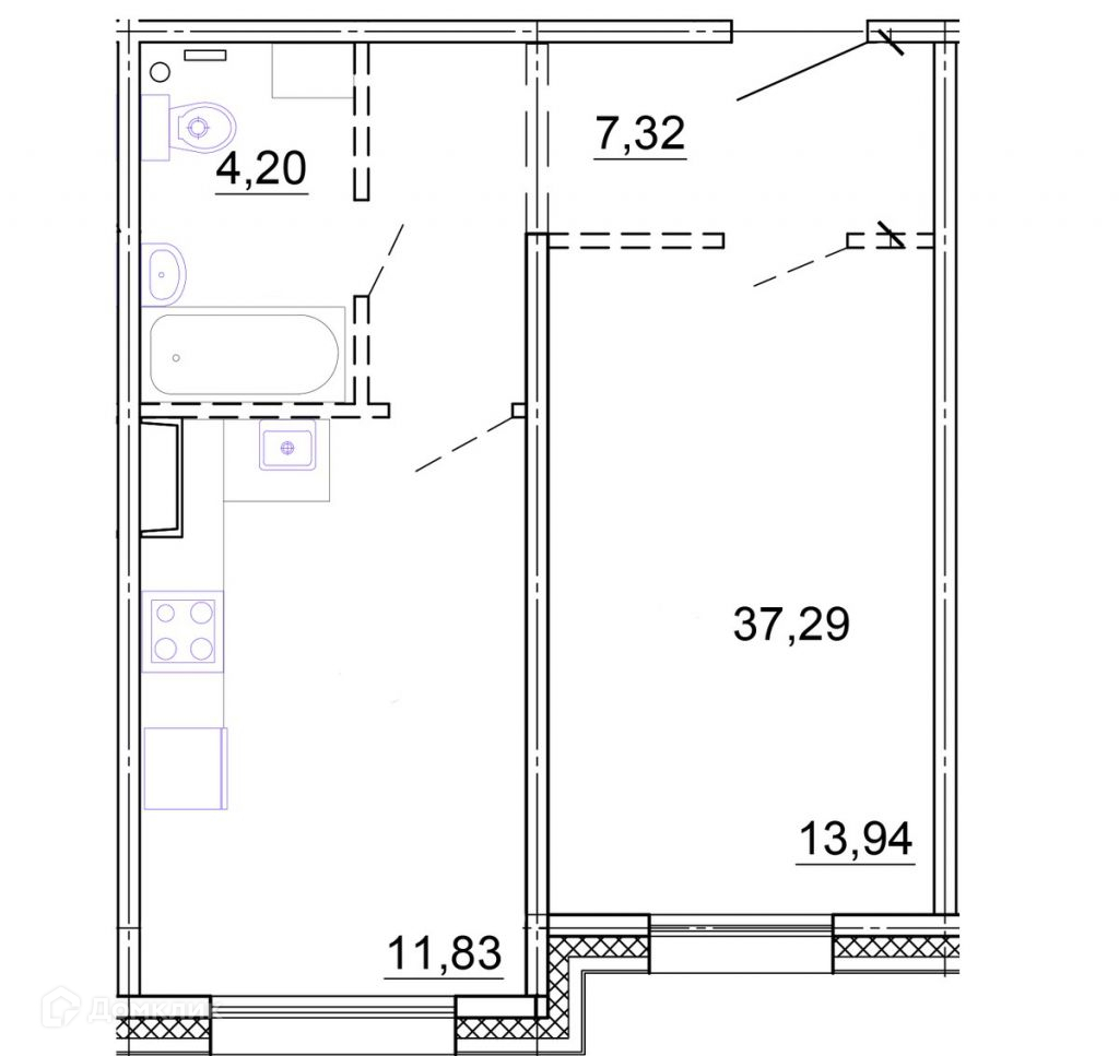Общая площадь 37.5 м2
