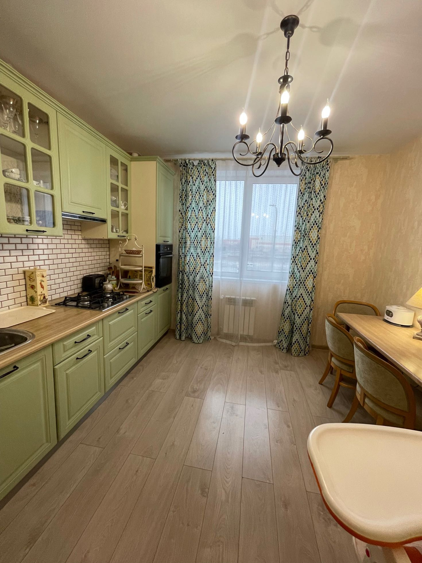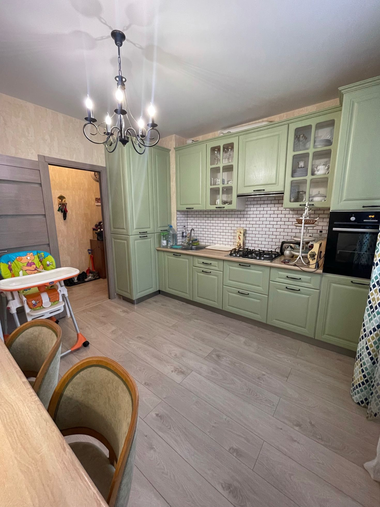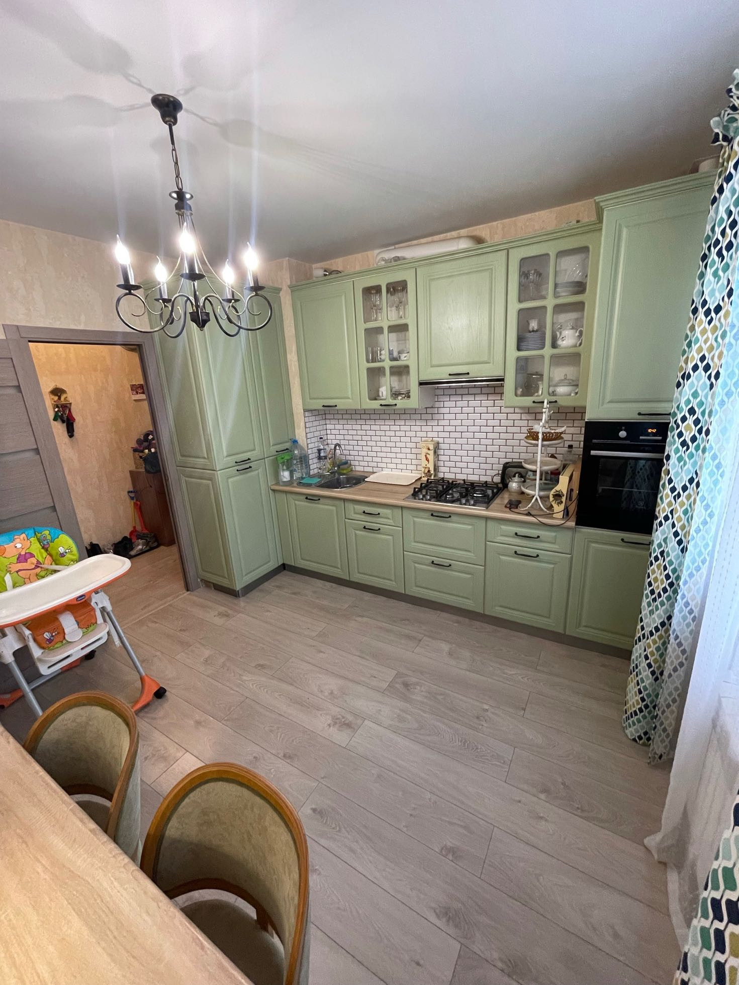 Новому владельцу  остаётся кухонный гарнитур со встроенной техникой - духовой шкаф и варочная поверхность марки Electrolux .