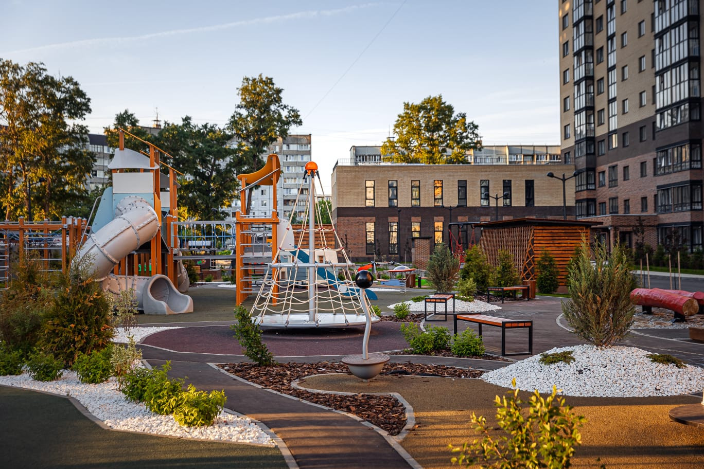 Придомовая территория: ландшафтный дизайн, эстетическое озеленение двора с растительностью. Детская площадка из дерева, отдельный корт для командных спортивных игр, атравматическое покрытие зон для отдыха, многоуровневое освещение. Закрытая территория обеспечивает дополнительный комфорт.