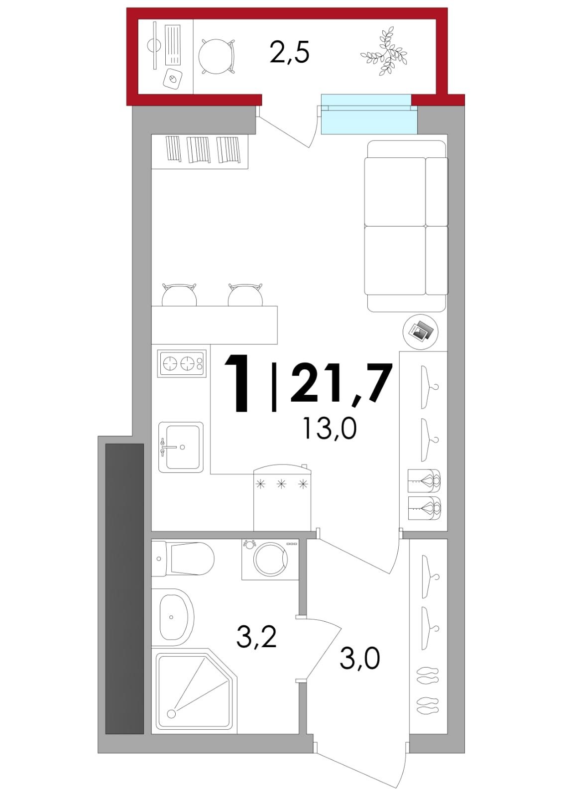 Общая площадь 21.6 м2
