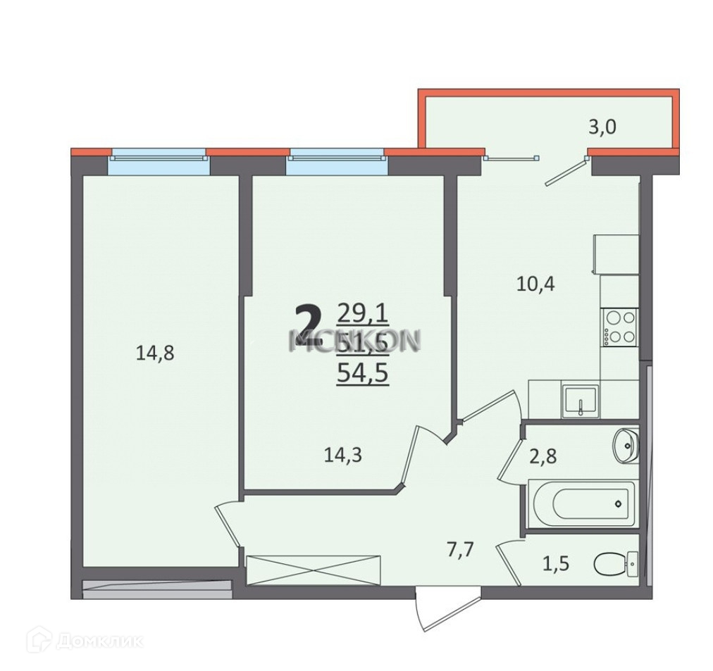 Общая площадь 54.5 м2