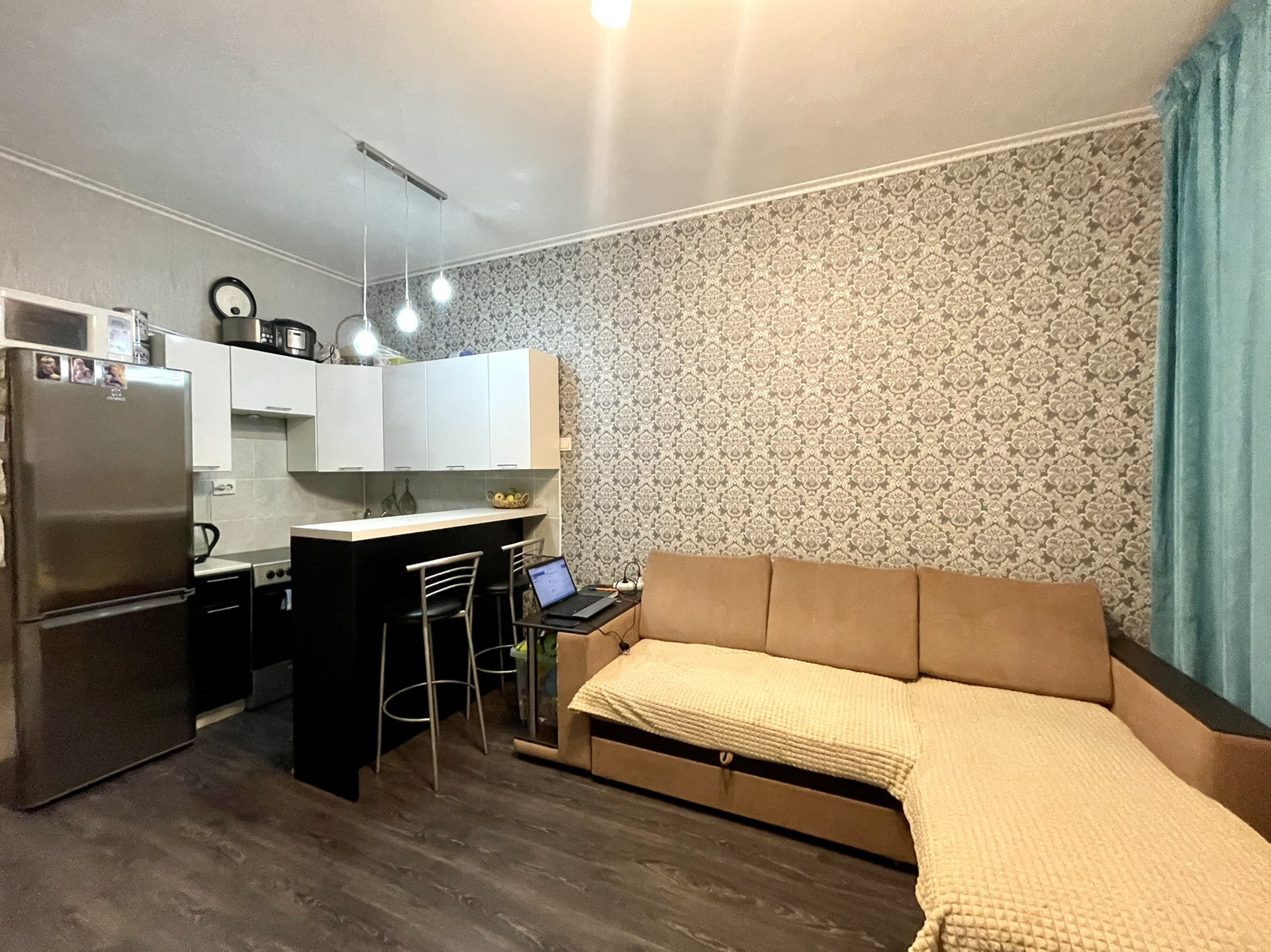 Продаётся однокомнатная квартира-Студия на 11 этаже 16 этажного панельного дома в Жк Молодежный, 2016 года постройки. В квартире выполнен качественный евроремонт, не от застройщика. Лоджия с панорамным остеклением, там легко поместился даже диван, на полу ламинат, санузел кафель, установлены приборы учета, хорошая сантехника, высокие потолки, остаётся кухонный гарнитур, диван, стиральная машина. Закрытая придомовая территория, парковка, детская и спортивная плош.адки, своя автономная котельная.