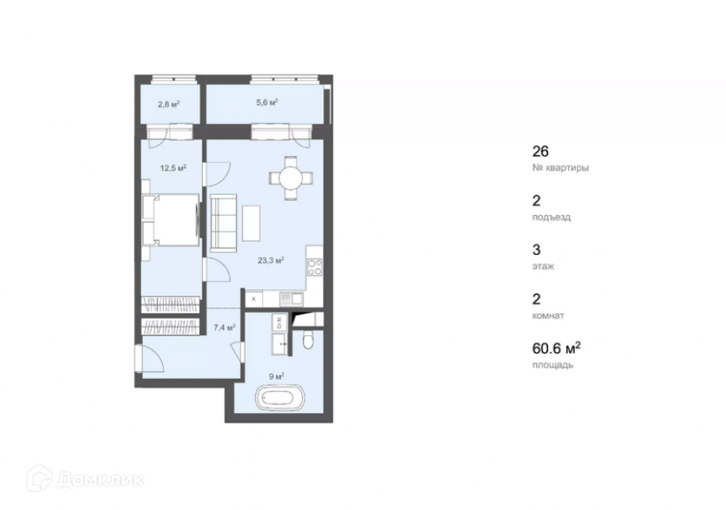 Общая площадь 60.6 м2
