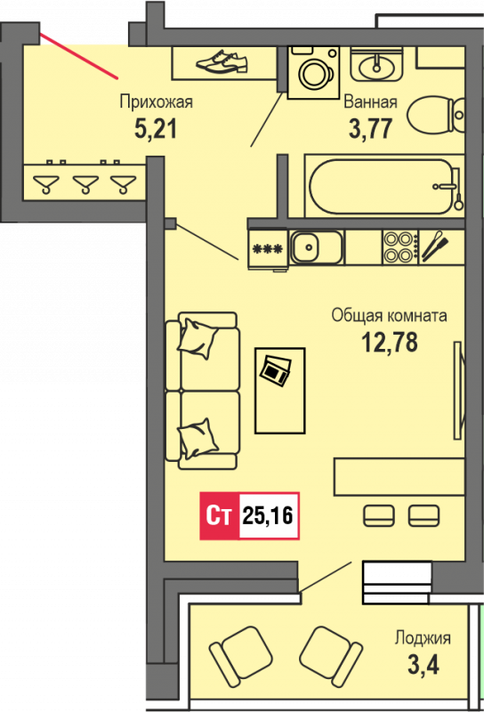 Общая площадь 25 м2