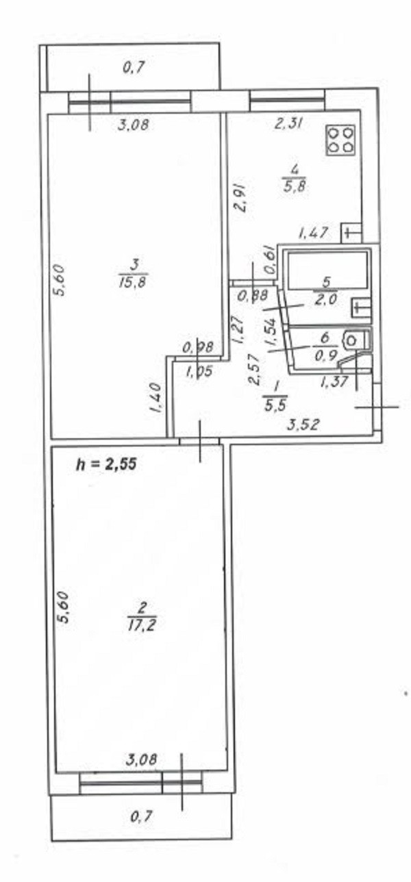 Площадь: общая 48.6 кв.м., комнаты 17,2 + 16 кв.м., кухня 6 кв.м.