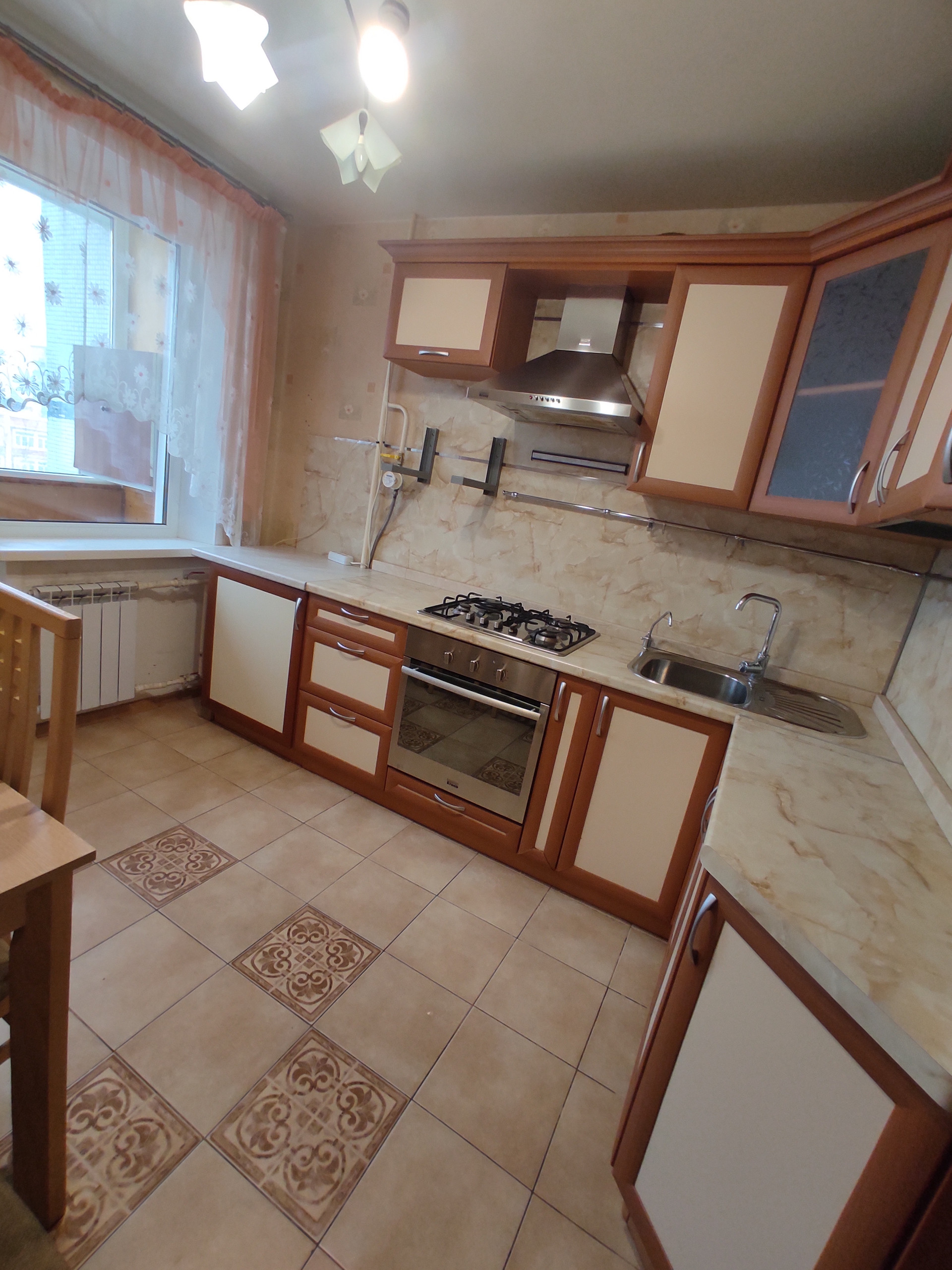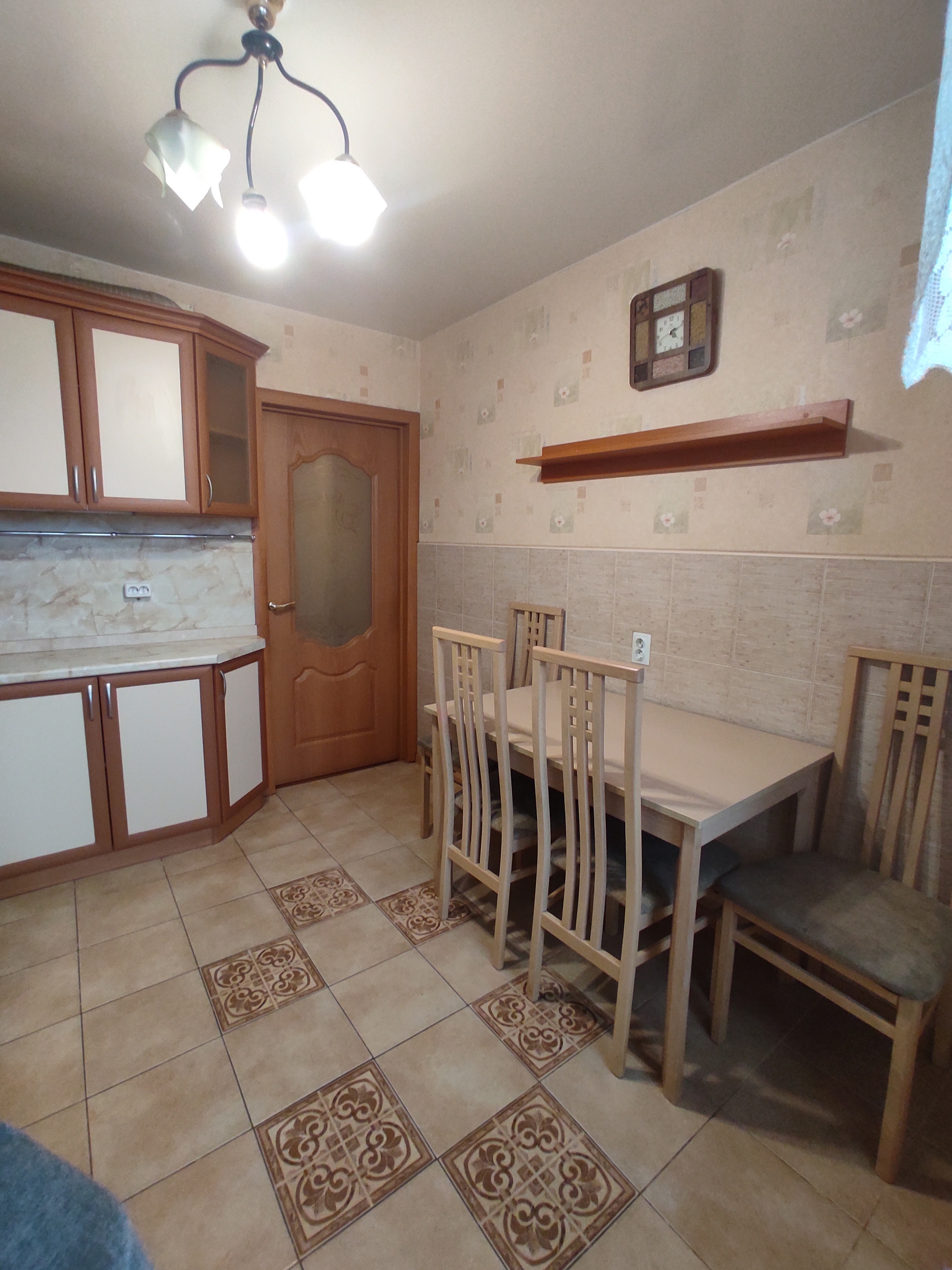 Кухня 8 кв.м остаётся встроенная кухня, стол, стулья. В кухне балкон- застеклён ПВХ.