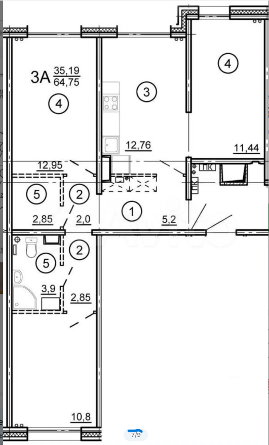 Жилая площадь 35.2 м2